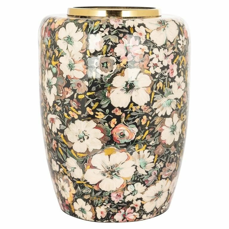 Wazon Chumono to wyjątkowy element dekoracyjny, który łączy elegancję z nowoczesnym stylem. Jego powierzchnia pokryta bogatym kwiatowym wzorem w delikatnych odcieniach bieli, różu i zieleni tworzy piękny kontrast z ciemnym tłem. Złote akcenty dodają mu blasku, nadając wazonowi luksusowego wykończenia. Idealnie wpisuje się w klasyczny, elegancki wystrój wnętrz, stanowiąc subtelny akcent, który przyciąga uwagę.