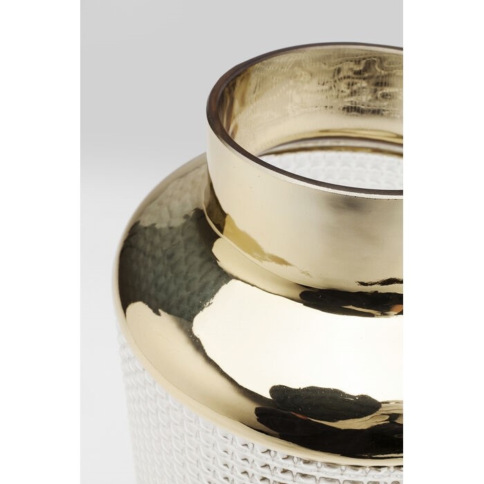 Wazon LA NOBLE o wysokości 30 cm to wyjątkowy element dekoracyjny, który harmonijnie łączy szlachetność szkła z luksusowymi złotymi akcentami. Złota krawędź doskonale podkreśla każdy bukiet kwiatów, czyniąc wazon idealnym wyborem na prezent przy szczególnych okazjach. Jego styl Glamour przyciąga uwagę ekstrawagancją i wyrafinowanym designem, a liniowe tłoczenie na powierzchni szkła tworzy efektowny kontrast z błyszczącymi złotymi detalami. Ręczne wykonanie zapewnia unikalność każdego egzemplarza, podkreślając wysoką jakość i dbałość o detale. To efektowna ozdoba, która doda prestiżu i elegancji każdemu wnętrzu.