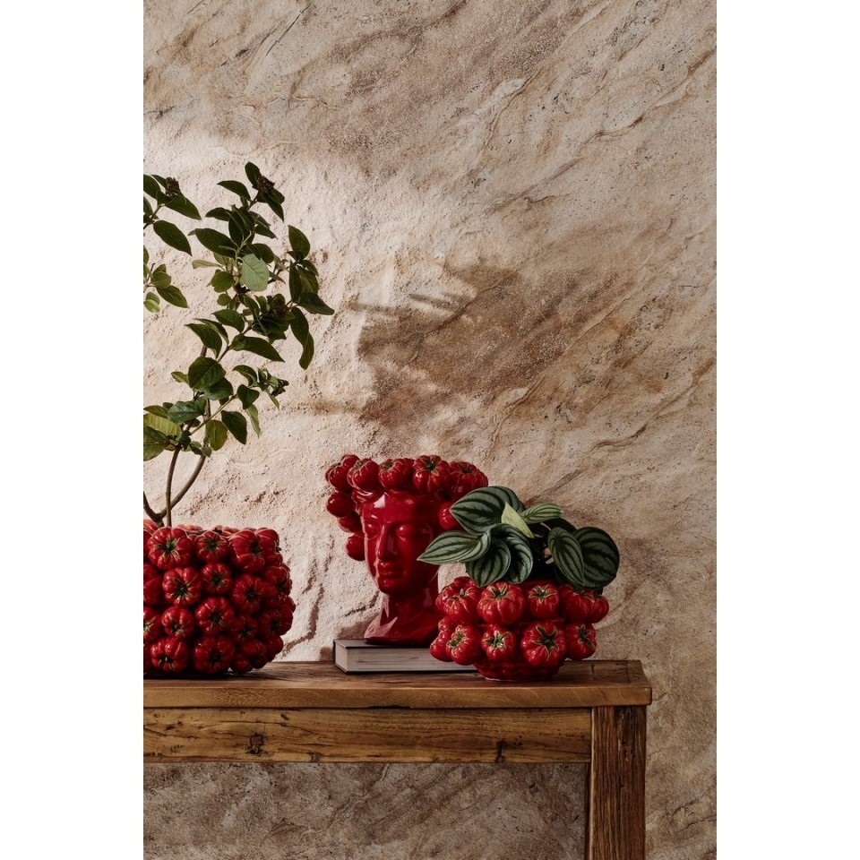 Wazon Gazpacho to wyjątkowy dodatek, który łączy oryginalny design z praktycznym zastosowaniem. Jego unikalna, okrągła forma z wypukłymi motywami pomidorów sprawia, że wyróżnia się w każdej aranżacji. Gładka, błyszcząca powierzchnia nadaje mu elegancki i nowoczesny charakter. Intensywny, czerwony kolor dodaje energii i ożywia przestrzeń. To nie tylko wazon, ale także artystyczny akcent, który przyciąga wzrok. Stanowi świetny wybór dla osób poszukujących dekoracji pełnych charakteru i oryginalności.