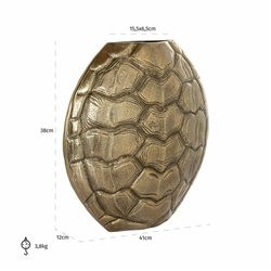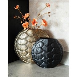 Wazon Lena, wykonany z aluminium, wyróżnia się unikalnym organicznym wzorem, który przypomina skorupę żółwia. Złoty odcień nadaje mu elegancji i wyrafinowania, dzięki czemu doskonale sprawdzi się jako dekoracja zarówno w nowoczesnych, jak i klasycznych aranżacjach. Model dostępny jest również w mniejszej wersji czarnej pod nazwą Ines, co umożliwia dopasowanie do różnorodnych stylów i aranżacji wnętrz.