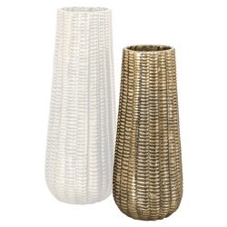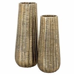 Wazon Loran L to wyrafinowany element dekoracyjny, który zachwyca elegancją i ponadczasowym stylem. Wykonany z aluminium i wykończony w szczotkowanym złocie, przyciąga wzrok swoją subtelną formą i teksturowaną powierzchnią. Jego duży rozmiar sprawia, że doskonale sprawdzi się zarówno jako efektowny wazon na kwiaty, jak i samodzielna dekoracja, podkreślając luksusowy charakter wnętrza. W połączeniu z mniejszym modelem z kolekcji umożliwia stworzenie spójnych i harmonijnych aranżacji.