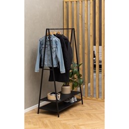 Wieszak na ubrania Selje w kolorze czarnym to elegancki i funkcjonalny element wyposażenia wnętrz. Wykonany z wytrzymałego metalu malowanego proszkowo na czarno, co zapewnia trwałość i nowoczesny wygląd. Posiada drążek na ubrania oraz dwie dolne półki, które są idealne do przechowywania butów lub innych akcesoriów. Jego minimalistyczny design, połączony z funkcjonalnością, czyni go idealnym rozwiązaniem do przedpokoju, sypialni czy biura. Wieszak Selje to połączenie stylu i funkcjonalności, które pomoże w organizacji przestrzeni, wprowadzając jednocześnie nowoczesny akcent do wnętrza.