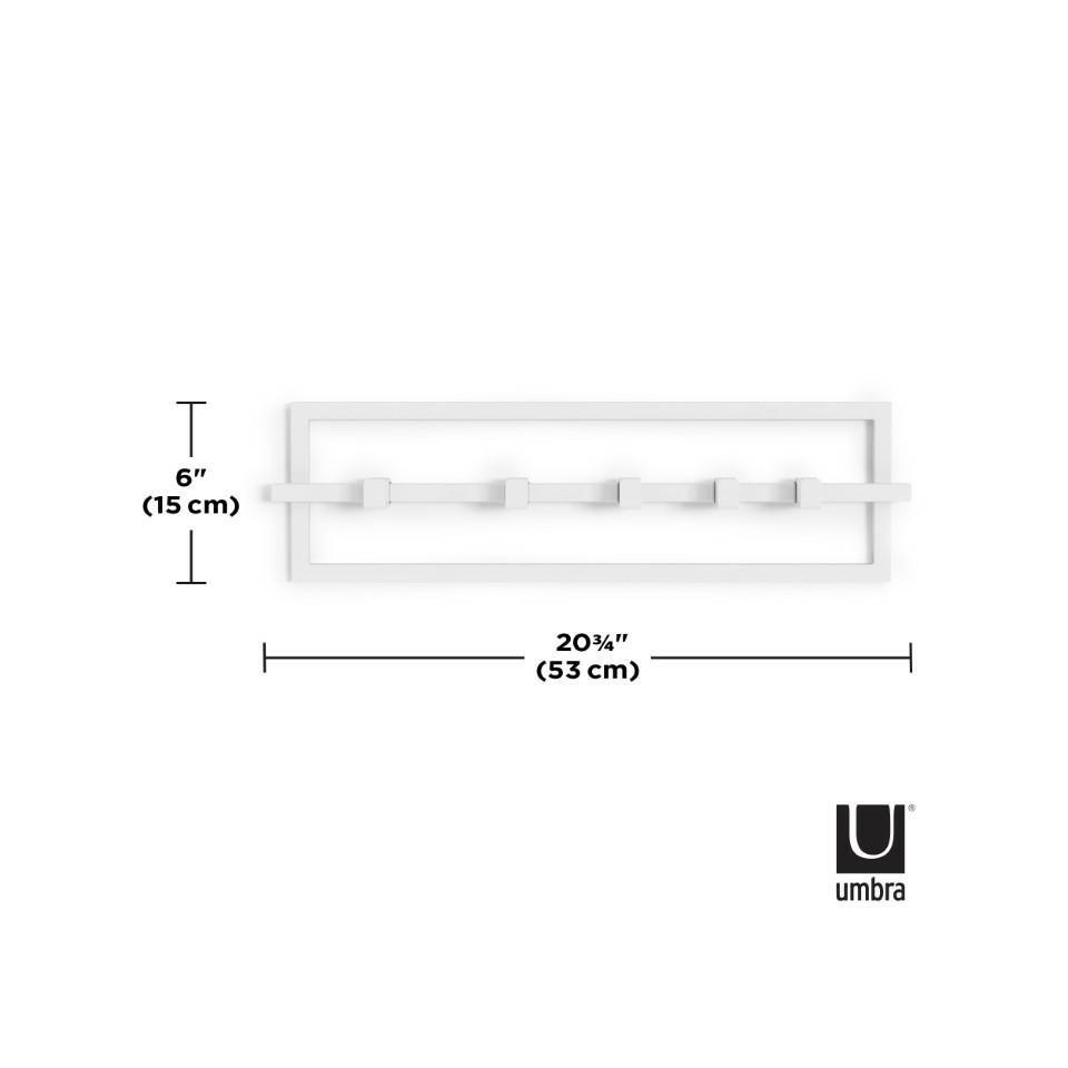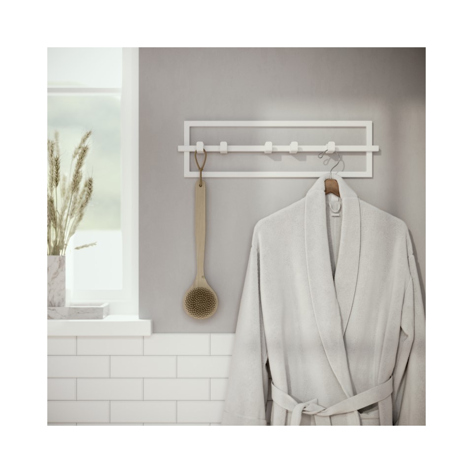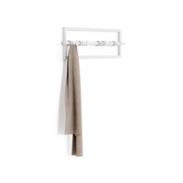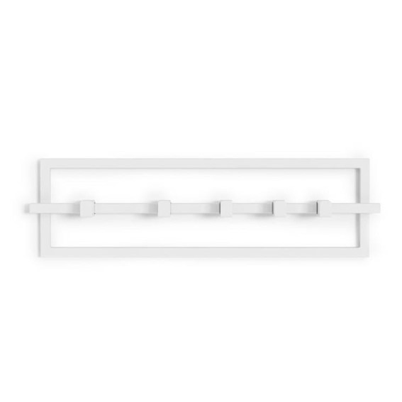Wieszak CUBIKO w kolorze białym wykonany jest ze stali, co gwarantuje trwałość i solidność. Biały kolor nadaje wyjątkowej elegancji i sprawia, że staje się uniwersalnym dodatkiem, który doskonale wkomponuje się w różne wnętrza. Wieszak jest wyposażony w pięć ruchomych haczyków na metalowej szynie, co dodaje funkcjonalności.