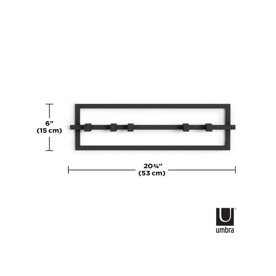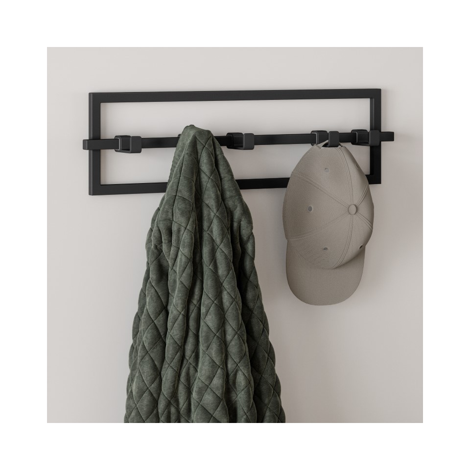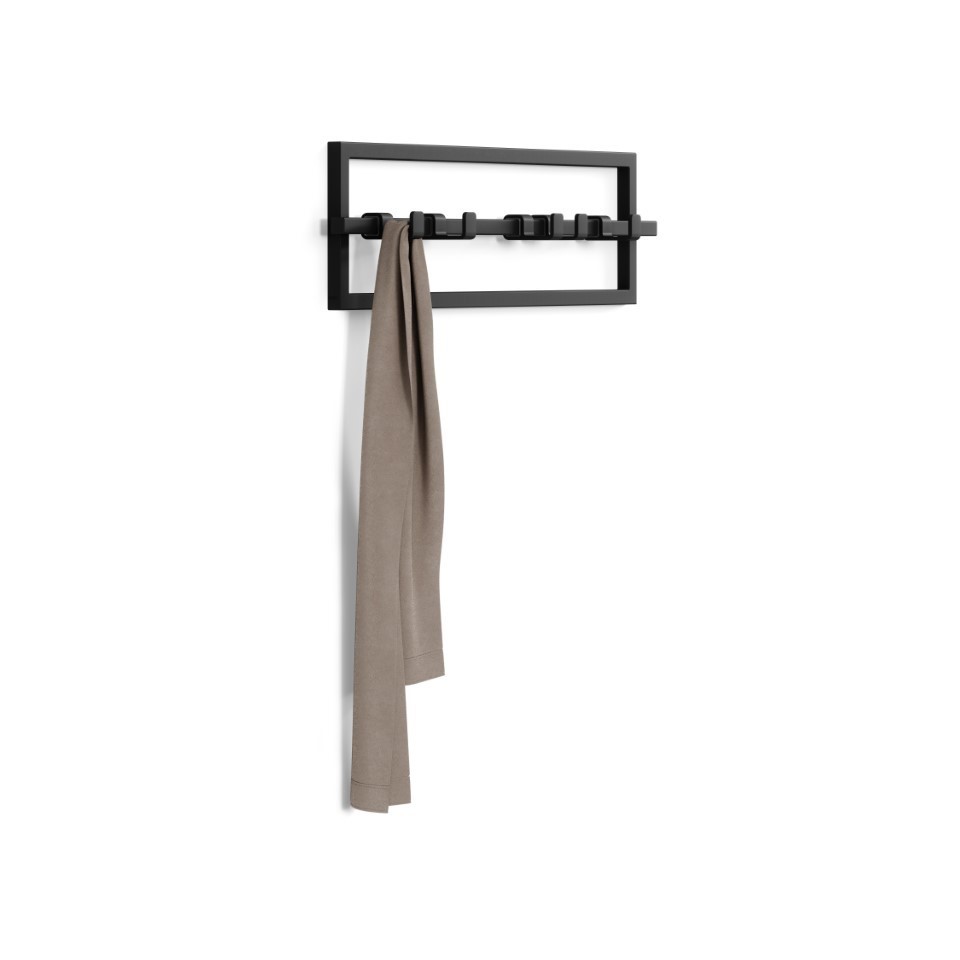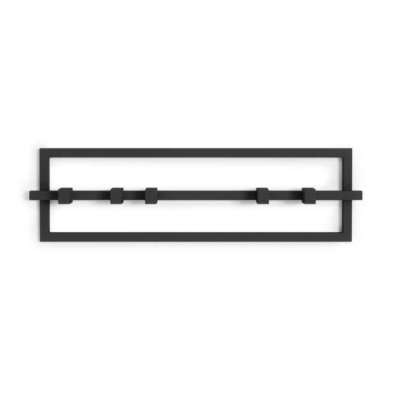 Wieszak CUBIKO w kolorze czarnym wykonany jest ze stali, co gwarantuje trwałość i solidność. Czarny kolor nadaje wyjątkowej elegancji i sprawia, że staje się uniwersalnym dodatkiem, który doskonale wkomponuje się w różne wnętrza. Wieszak jest wyposażony w pięć ruchomych haczyków na metalowej szynie, co dodaje funkcjonalności.