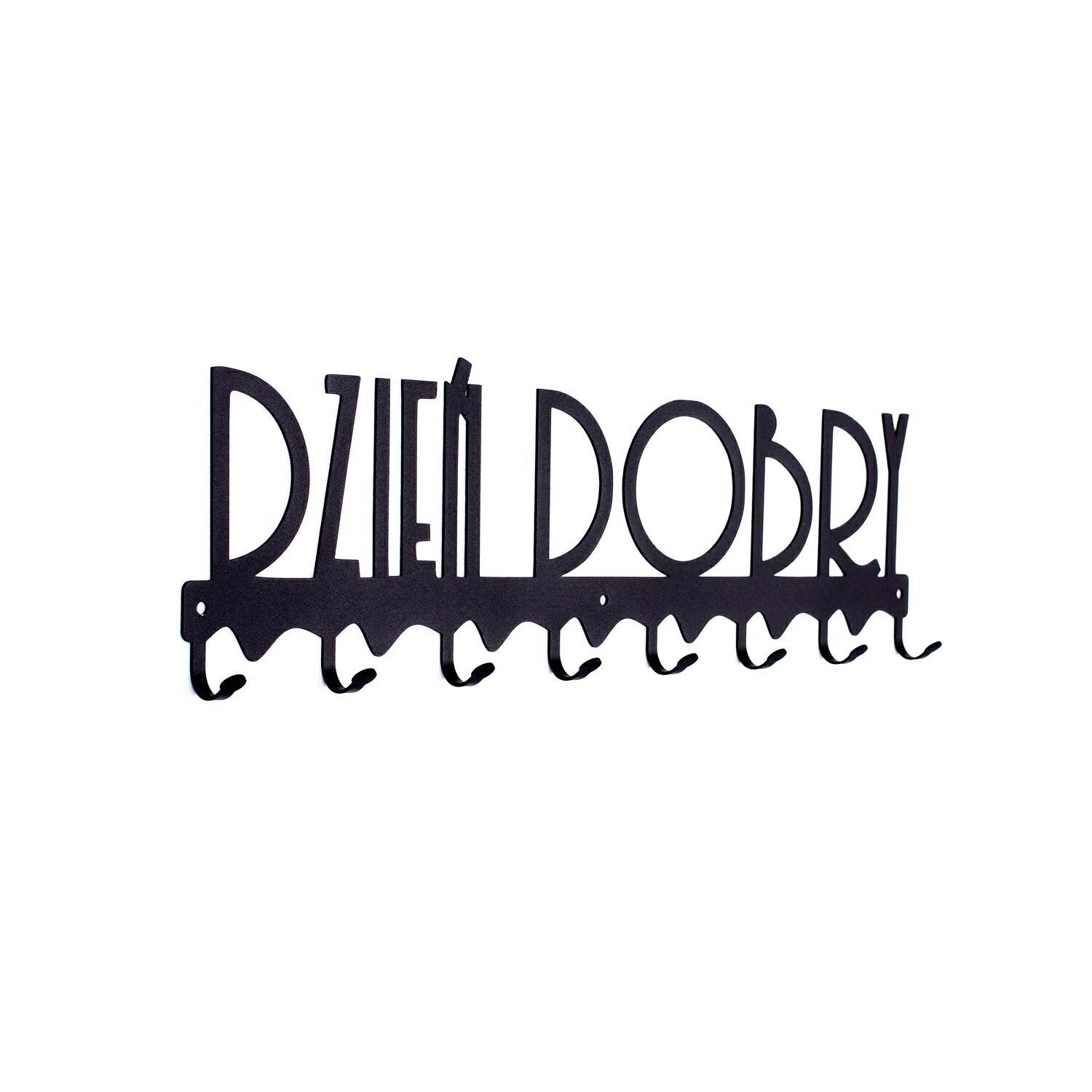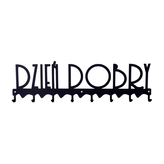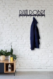 Wieszak ścienny Dzień dobry jest praktycznym rozwiązaniem do każdego przedpokoju, holu lub poczekalni. Wycinany laserowo uniwersalny napis ociepli każde wnętrze.Produkt wykonany został z wytrzymałego metalu malowanego proszkowo. Wieszak posiada 8 haczyków, o maksymalnym obiciążeniu 3kg każdy, które pomogą utrzymać porządek na korytarzu, holu czy poczekalni. Utrzymany w eleganckim stylu wieszak wtopi się we wnętrze dodając mu wyjątkowo przytulnego charakteru. Maksymalne obciążenie listwy to 24kg. Do wieszaka załączony jest zestaw montażowy, składający się z kołków, śrubek i zaślepek. Wysokość: 18cm Szerokość: 60cm Max. ilość sztuk w kartonie:1 Wymiary kartonu: 25cm x 67cm x 4cm Waga opakowania: 2kg