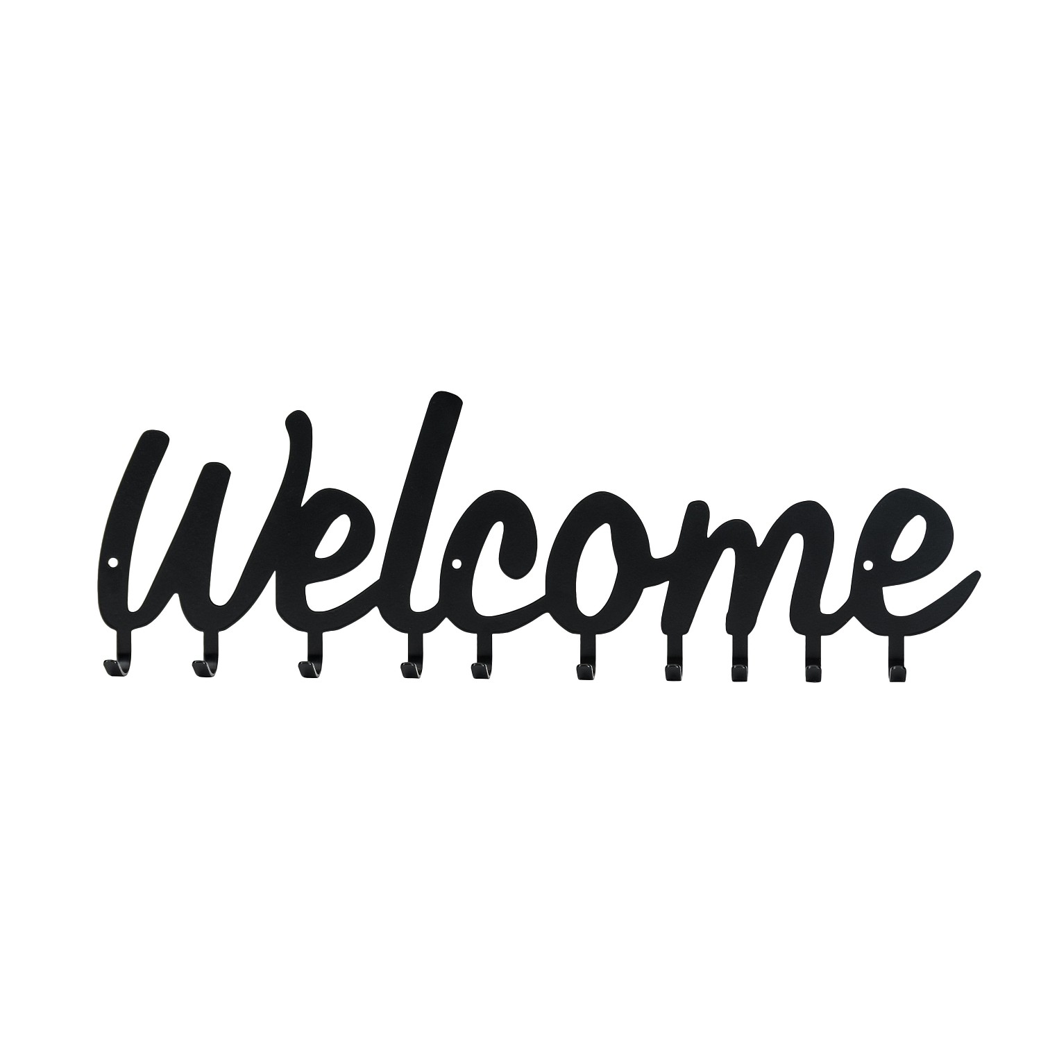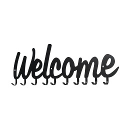 Wieszak ścienny Welcome to nowoczesne rozwiązanie do przedpokoju, holu lub poczekalni. Jego precyzyjnie wycięty laserowo wzór, z napisem witającym gości, nada uroku każdemu wnętrzu. Stalowy malowany proszkowo wieszak jest uniwersalny oraz odporny na uszkodzenia. Matowe wykończenie dodaje listwie stylu. Dzięki aż 10 haczykom o udźwigu do 3kg każdy, możemy powiesić na wieszaku klucze, kurtki lub nawet torby. Produkt dostępny jest w dwóch kolorach co zwiększa jego możliwości aranżacyjne. Maksymalne obciążenie to 30kg. Do wieszaka załączany jest zestaw montażowy, który składa się z kołków, zaślepek i śrubek.