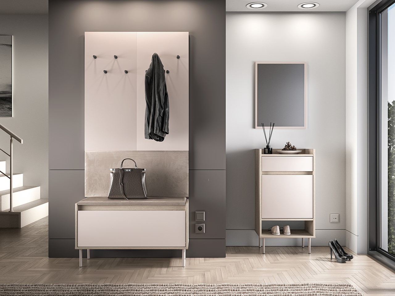 Wieszak Voco to praktyczny i stylowy mebel do przedpokoju. Wyposażony w wytrzymałe haczyki na odzież wierzchnią oraz miękką, tapicerowaną powierzchnię u dołu, pozwala wygodnie zawiesić ubrania i usiąść przy zakładaniu butów. Prosty, elegancki design wprowadza poczucie ciepła do wnętrza, a mebel doskonale komponuje się z szafkami na buty Voco.