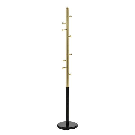 Wieszak o wysokości 172 cm to połączenie funkcjonalności i elegancji, które wprowadzi wyjątkowy akcent do Twojej przestrzeni. Wykonany z wysokiej jakości stali chromowanej i stali malowanej proszkowo, prezentuje się niezwykle stylowo, zestawiając w sobie nowoczesność z subtelnym luksusem. Jego solidna konstrukcja zapewnia stabilność i trwałość, co sprawia, że jest idealnym rozwiązaniem do przechowywania różnorodnych ubrań. Natomiast złote akcenty dodają mu niepowtarzalnego charakteru, podkreślając elegancję pomieszczenia, w którym się znajduje. Dbałość o szczegóły i staranne wykonanie sprawiają, że wieszak nie tylko spełnia swoją funkcję, ale również staje się wyjątkowym elementem dekoracyjnym. Czarny kolor w połączeniu ze złotymi akcentami tworzy harmonijną kompozycję, która doskonale komponuje się z różnymi stylami wnętrz, dodając im wyrafinowanego charakteru.
