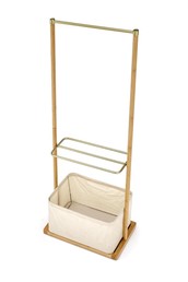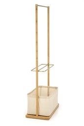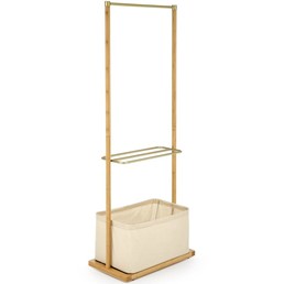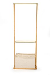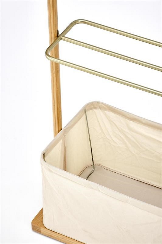 Wieszak WU-31 to praktyczny element wyposażenia korytarza lub garderoby. Solidna konstrukcja wieszaka wykonana jest z bambusa w naturalnym kolorze. Boczne elementy wieszaka połączone są rurką i półką wykonaną ze stali pokrytej złotą farbą proszkową. Na półce możemy postawić torebkę lub szkolny plecak. Wieszak WU-31 posiada beżowy materiałowy kosz na bambusowej podstawie, w którym możemy przechowywać ubrania takie jak czapki czy szaliki. Stojący wieszak doskonale sprawdzi się w stylu skandynawskim i orientalnym.