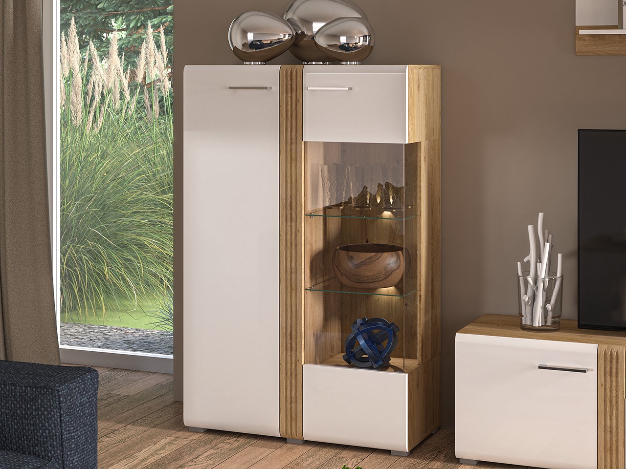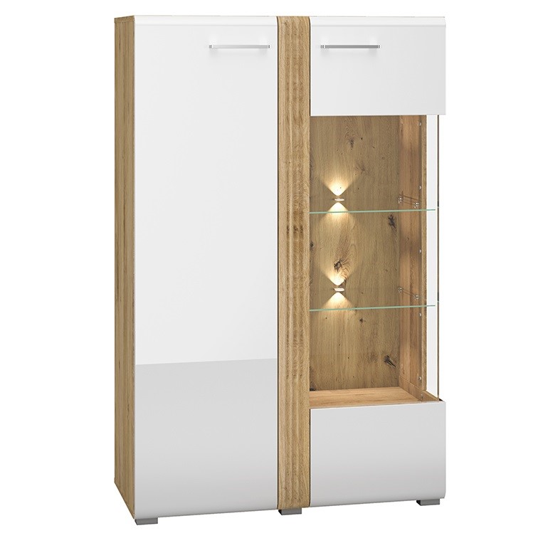 Witryna Adagio 03 Prawy Dąb Castello wyróżnia się klasycznym designem i nowoczesną funkcjonalnością. Dzięki cichemu domykowi, witryna zapewnia komfort codziennego użytkowania, a opcjonalne podświetlenie witryny wprowadzi subtelny, nastrojowy akcent do wnętrza.