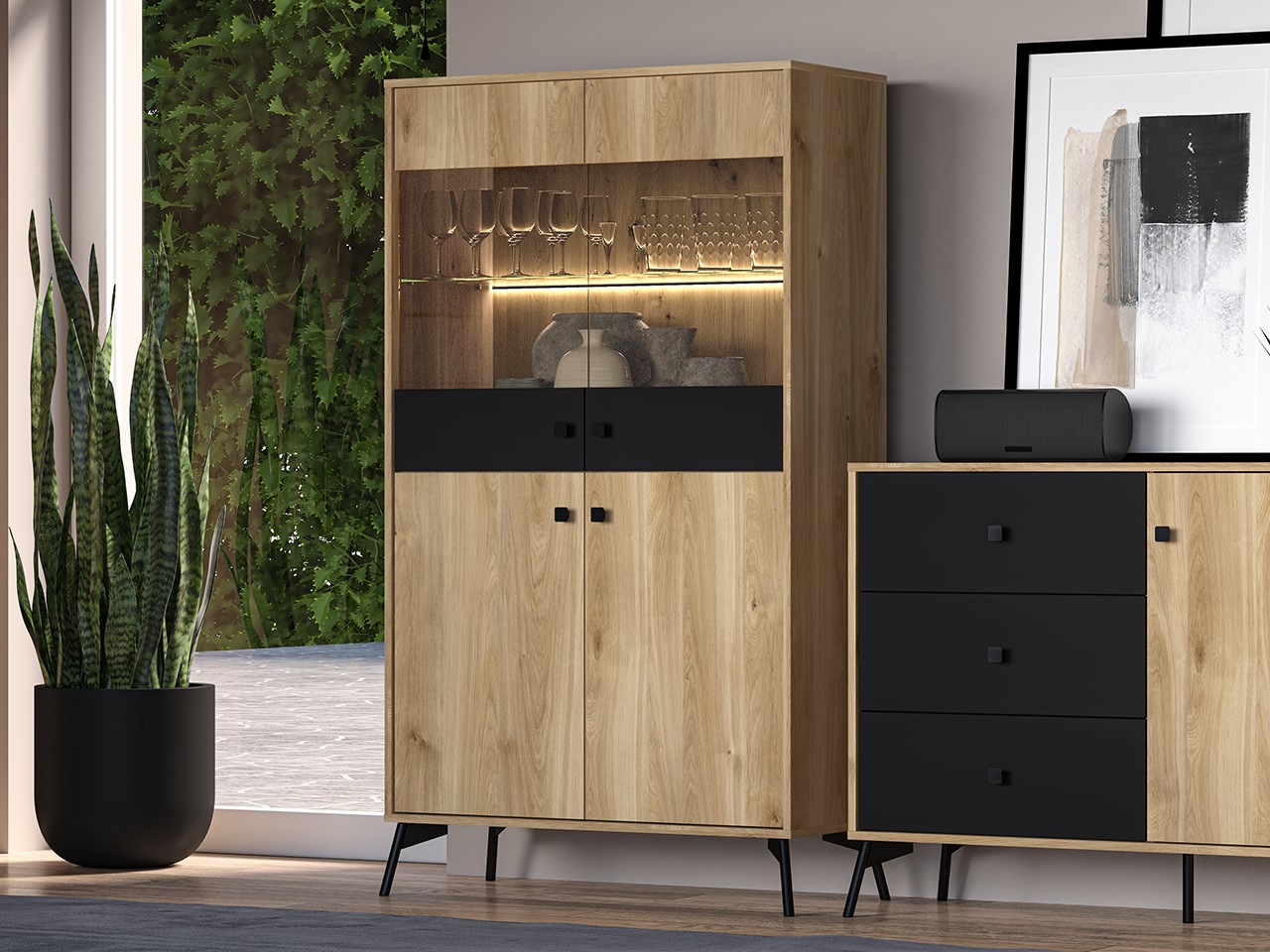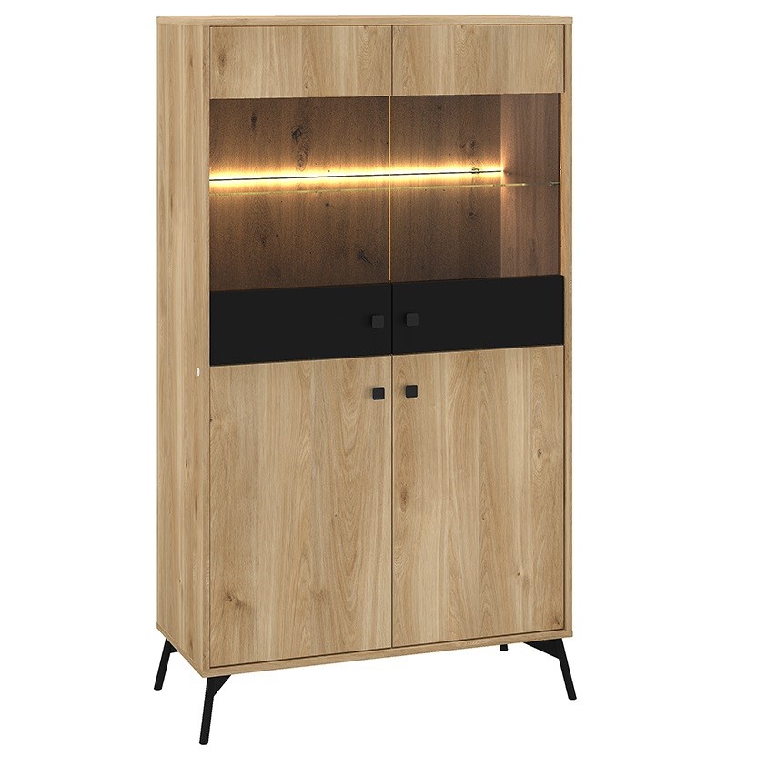 Witryna Agis 03 to połączenie stylu i funkcjonalności. Wyposażona w dotykowy włącznik światła i podświetlenie wnętrza, doskonale prezentuje eksponowane przedmioty. Solidne wykonanie z wytrzymałej płyty i ABS oraz zwiększona ładowność szuflad czynią ją praktycznym dodatkiem do każdego wnętrza.
