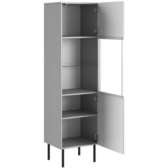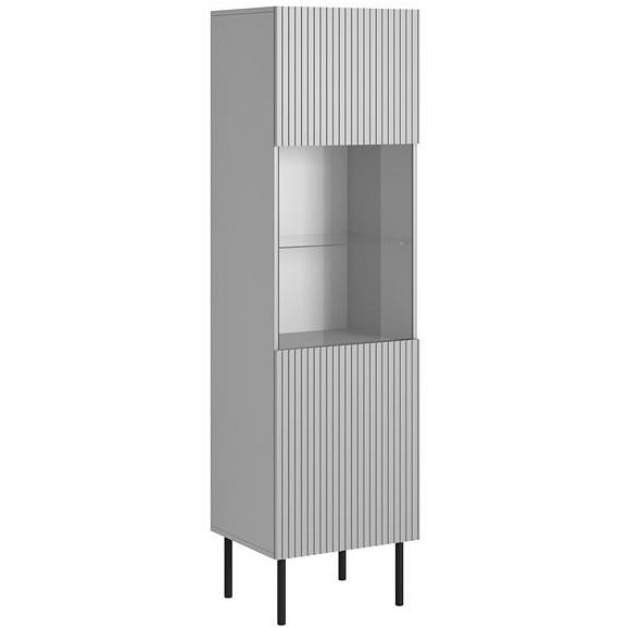 Witryna ASENSIO W-1 to nowoczesna witryna do salonu z laminowaną ramą i frontami z jasnoszarej laminowanej płyty MDF. Czcionka jest częściowo przeszklona, a za szkłem znajduje się szklana półka, która pozwala na efektowne wyeksponowanie umieszczonych dekoracji i pamiątek. Wysoka witryna ASENSIO W-1 z ryflowanym frontem oferuje dużo miejsca do przechowywania. Dzięki stałej gablocie oraz pozostałym meblom z kolekcji możesz stworzyć niepowtarzalny mebel do salonu.