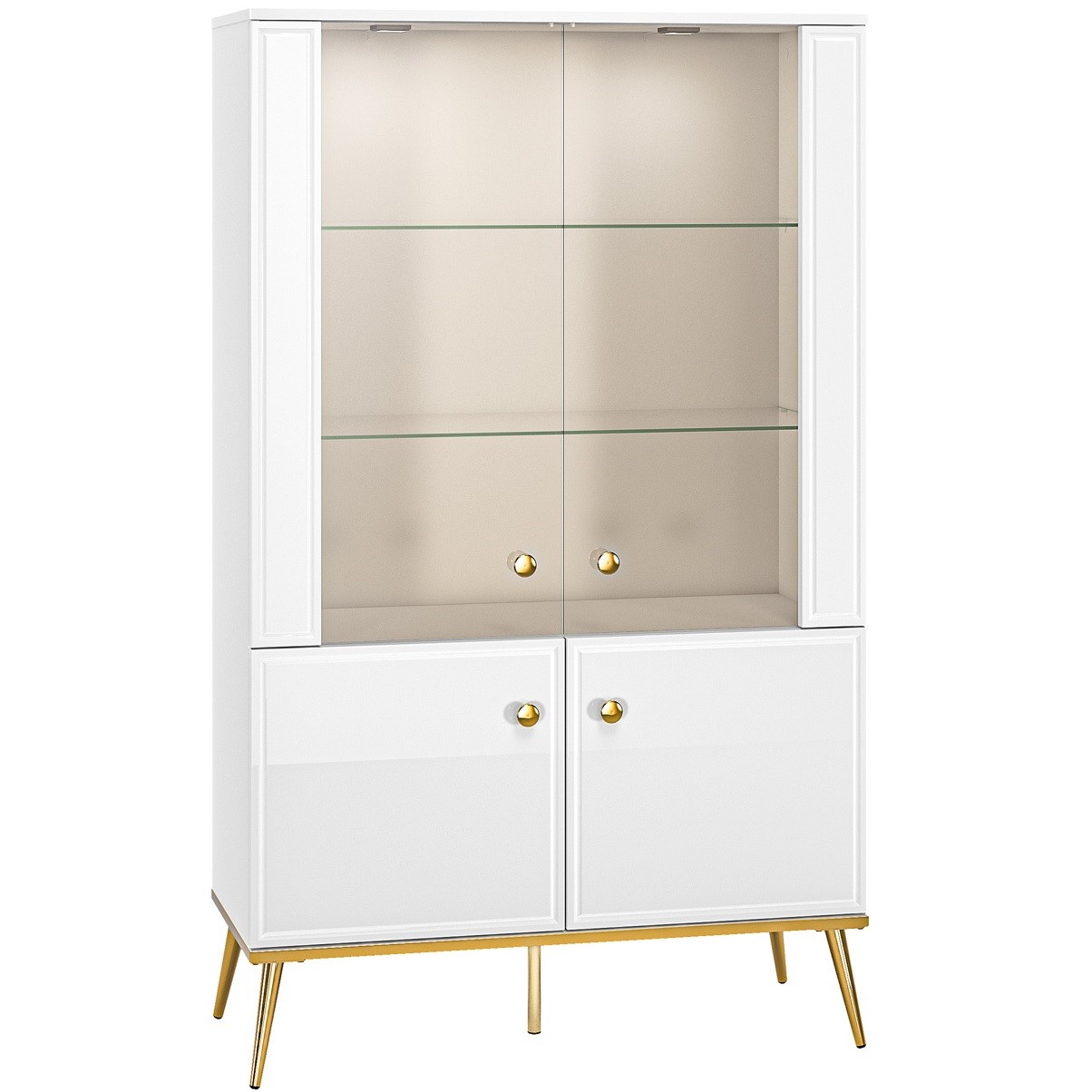 Witryna Goldin 03 Biały Alpejski/Biały Połysk to nowoczesny mebel z wbudowanym oświetleniem i dotykowym włącznikiem światła, oferujący funkcję cichego domyku i solidne wykończenie. Dzięki wysokiej jakości materiałom będzie służyć przez lata, a estetyczne detale wprowadzą elegancję do każdego wnętrza.