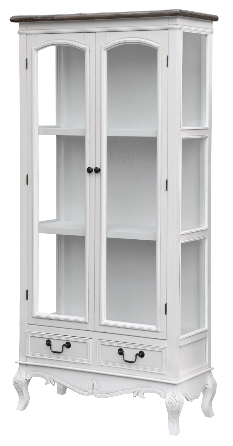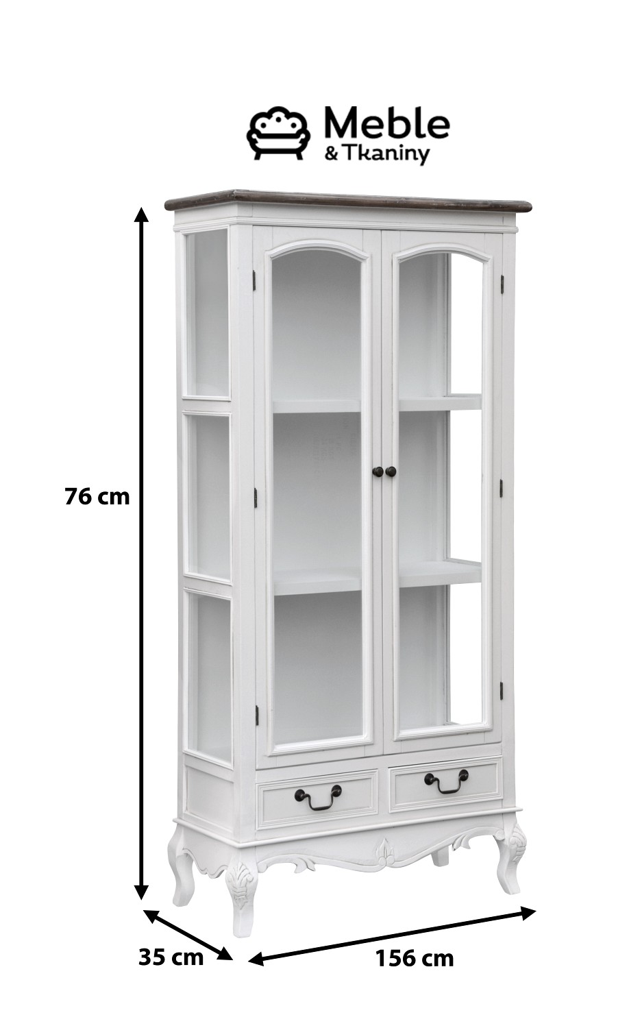 Biała, dwudrzwiowa witryna w stylu francuskim. Za szybą znajdują się trzy półki, na których możesz wyeksponować swoją najpiękniejszą porcelanę. Dodatkowym miejscem do przechowywania sa dwie szuflady umieszczone na dole mebla. Rewelacyjnie sprawdza się na drobiazgi. Gustowne rzeźbienia o motywach roślinnych zostały zaakcentowane ciemniejszym kolorem, dzięki czemu wzór jest doskonale podkreślony. Stylowo gięte nóżki i okucia wzorowo komponują się z całością.