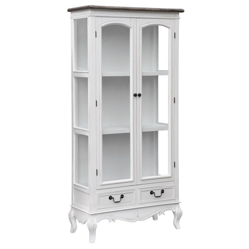 Biała, dwudrzwiowa witryna w stylu francuskim. Za szybą znajdują się trzy półki, na których możesz wyeksponować swoją najpiękniejszą porcelanę. Dodatkowym miejscem do przechowywania sa dwie szuflady umieszczone na dole mebla. Rewelacyjnie sprawdza się na drobiazgi. Gustowne rzeźbienia o motywach roślinnych zostały zaakcentowane ciemniejszym kolorem, dzięki czemu wzór jest doskonale podkreślony. Stylowo gięte nóżki i okucia wzorowo komponują się z całością.