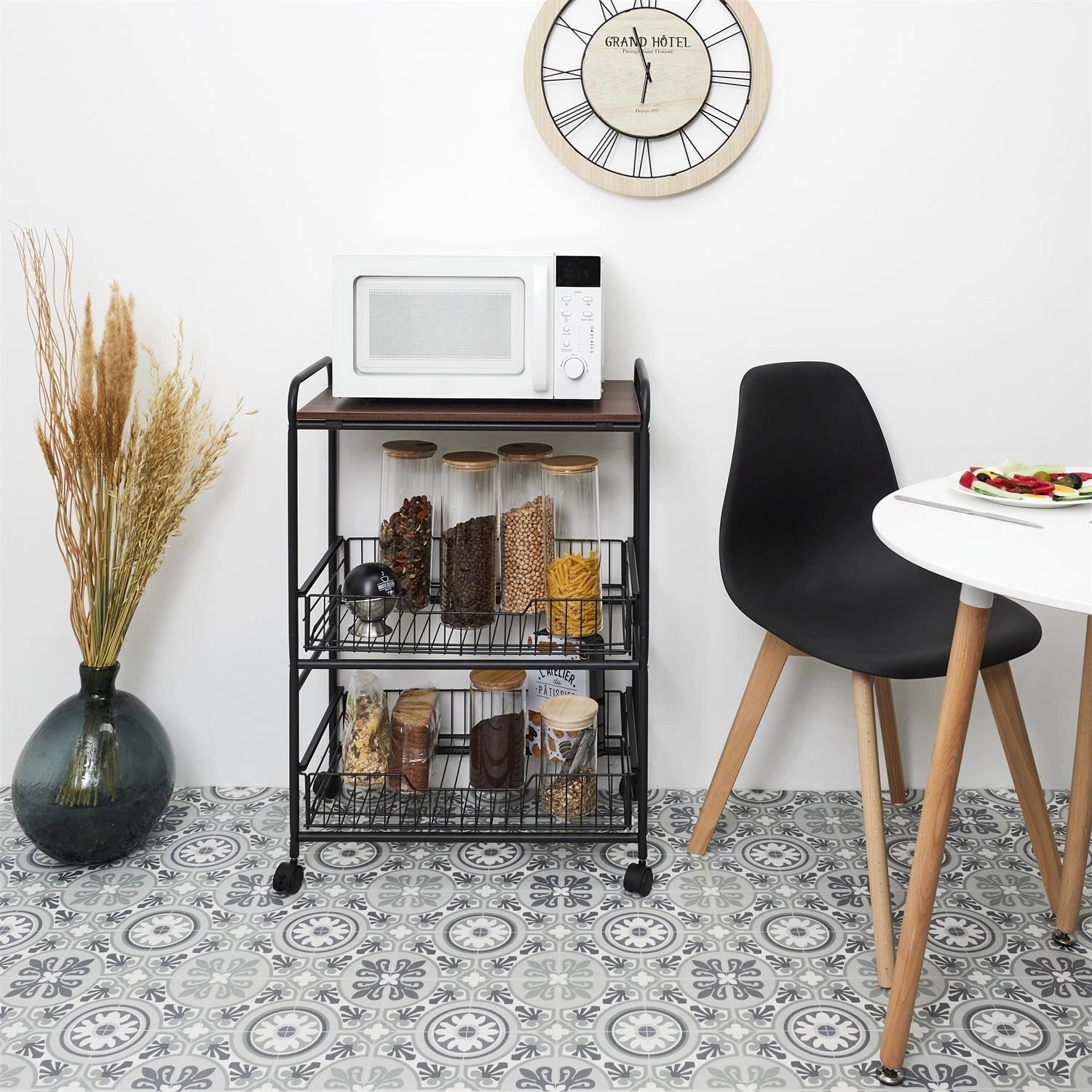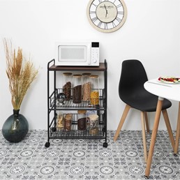 Wózek barek to elegancki i funkcjonalny dodatek do każdego wnętrza. Wykonany z wysokiej jakości materiałów, zapewnia trwałość i stylowy wygląd. Posiada trzy półki, które oferują dużo miejsca na przechowywanie napojów, kieliszków i akcesoriów barowych. Czarne wykończenie nadaje mu nowoczesny i minimalistyczny wygląd, idealny do nowoczesnych wnętrz. Dzięki zamontowanym kółkom, wózek jest łatwy do przemieszczania, co czyni go niezwykle praktycznym. Jego kompaktowe wymiary umożliwiają oszczędność miejsca, jednocześnie zapewniając dużą funkcjonalność.