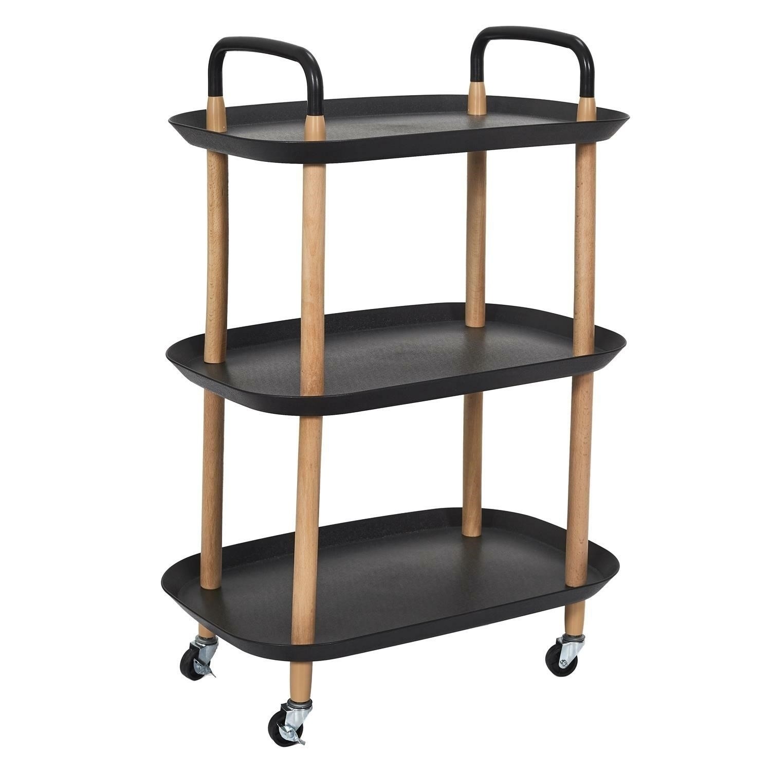 Wózek/stolik Kaleo to funkcjonalne rozwiązanie, które sprawdzi się w różnych pomieszczeniach. Dzięki kółkom można go swobodnie przemieszczać, co czyni go idealnym pomocnikiem w kuchni, salonie czy nawet biurze. Wykończenie w kolorze czarnym z naturalnym akcentem dodaje mu elegancji i uniwersalności. Solidna konstrukcja zapewnia stabilność, a praktyczne półki umożliwiają wygodne przechowywanie niezbędnych przedmiotów. To stylowy dodatek, który łączy w sobie estetykę i praktyczność.