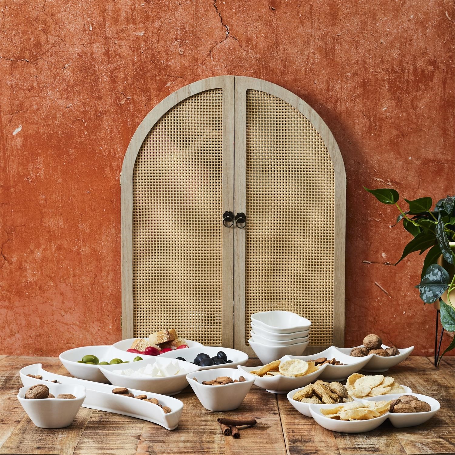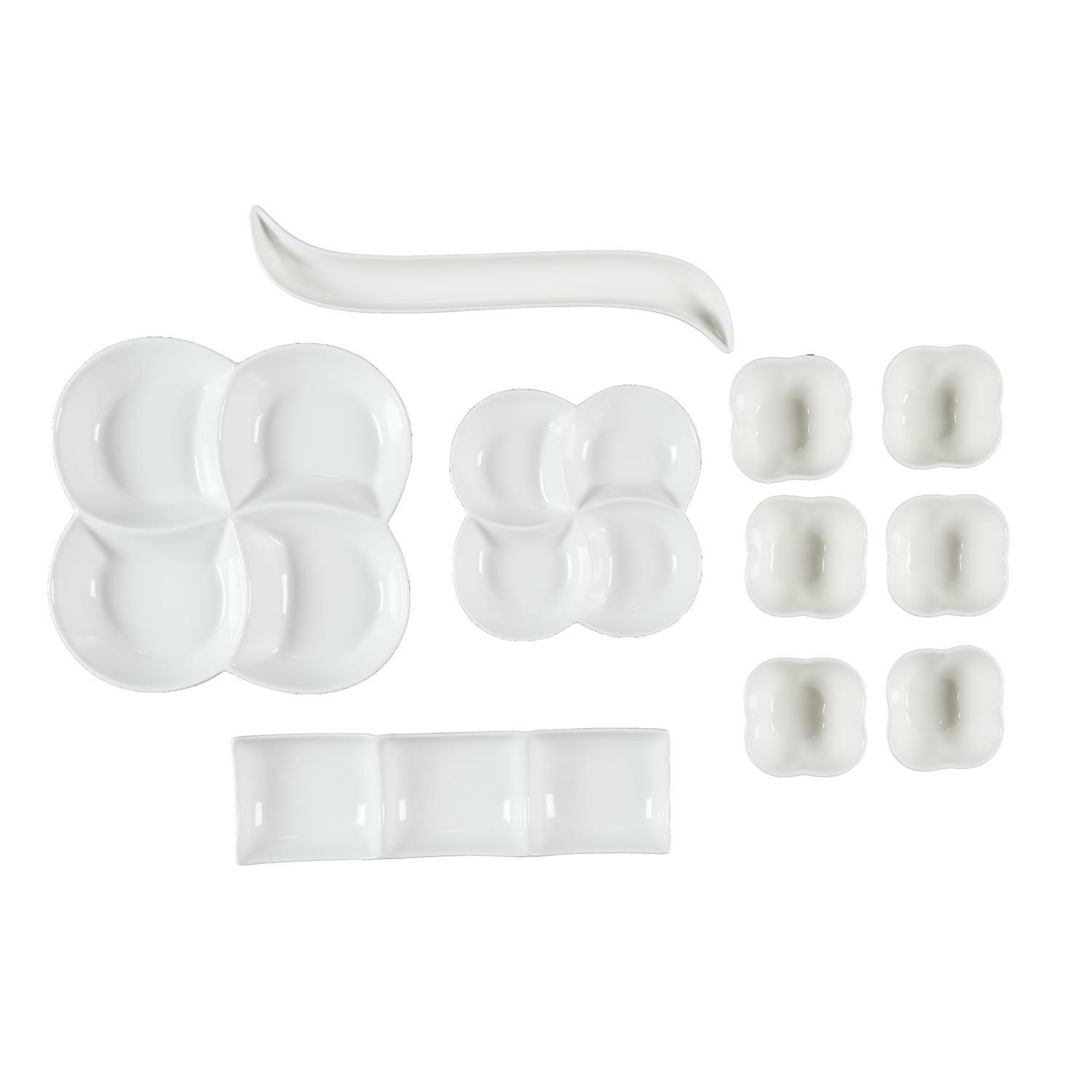 Zestaw białych naczyń do serwowania przystawek to praktyczne i eleganckie rozwiązanie na przyjęcia i codzienne posiłki. Składa się z 10 różnych elementów – miseczek i talerzyków – które umożliwiają estetyczne podanie przekąsek, sosów, serów czy sushi. Klasyczny biały kolor pasuje do każdej zastawy stołowej i podkreśla naturalny wygląd potraw. Idealny wybór dla miłośników estetycznej prezentacji dań i domowych spotkań przy stole.