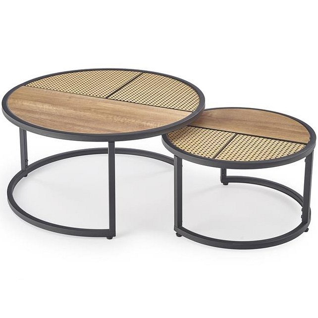 Nowoczesny zestaw ławek GARMINA składa się z dwóch okrągłych ławek, których górna część to połączenie mlecznej płyty MDF i syntetycznego rattanu. Blaty robocze różnej wielkości w takim połączeniu materiałów to rekomendacja dla osób, które szukają pięknych i nietuzinkowych rozwiązań do swojego mieszkania. Zestaw oszczędza miejsce, ponieważ ławki mogą stać obok siebie, ale mniejszą ławkę można też wsunąć pod większą. Blaty stołów osadzone są na stalowych ramach malowanych proszkowo na czarno, które charakteryzują się wyjątkową twardością i trwałością. Z pomocą zestawu ław GARMINA można stworzyć wspaniały klimat we wnętrzu, w którym stoi, pięknie komponując się z loftową aranżacją industrialnych przestrzeni. Ławki doskonale sprawdzą się w poczekalni lub salonie.
