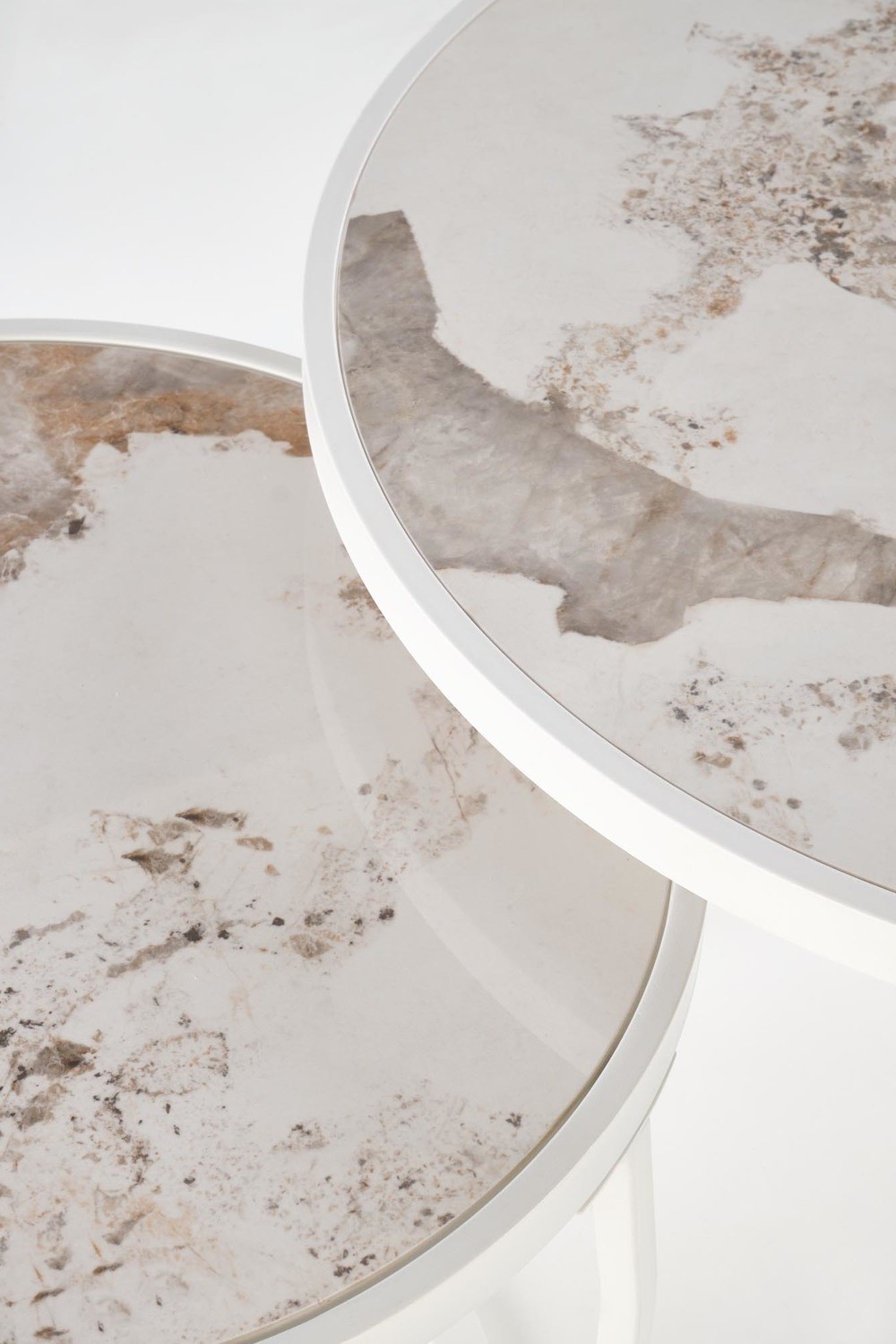 Obydwie ławy wykonane są z spieku w kolorze beżowego marmuru, co zapewnia im wyjątkową trwałość i odporność na zarysowania oraz plamy.