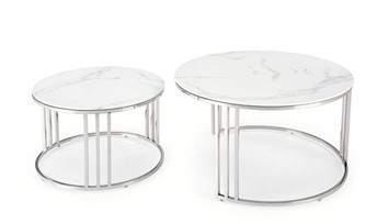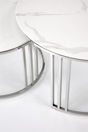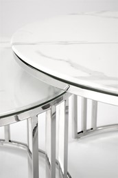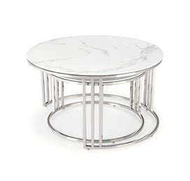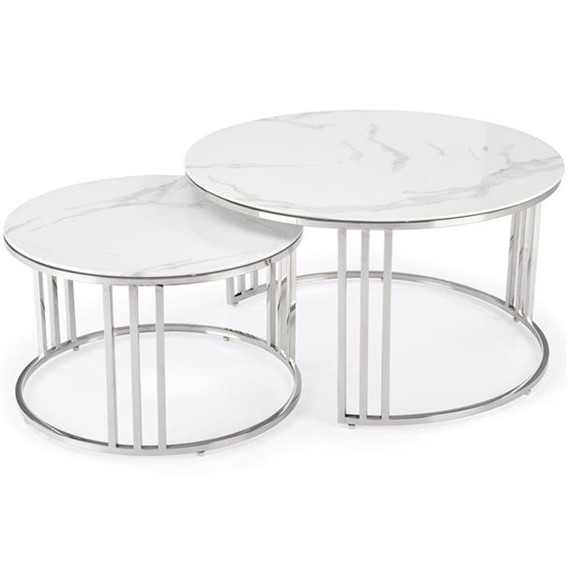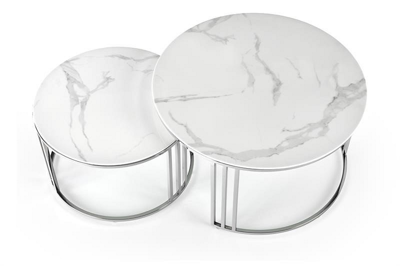 Seria stolików kawowych MERCURY 2 to dwa stoliki kawowe o różnej wielkości, stworzone z myślą o osobach poszukujących pięknych i nietuzinkowych rozwiązań do wnętrza w stylu glamour. Oszczędzają miejsce, ponieważ ławki mogą stać obok siebie, ale istnieje również możliwość wsunięcia mniejszej ławki pod większą. Blaty wykonane są ze szkła z białego marmuru i osadzone na chromowanych stalowych ramach charakteryzujących się wyjątkową twardością i trwałością. Srebrne wykończenie stelaży dodaje stolikowi kawowemu elegancji i ekskluzywnego designu. Szklany zestaw ław MERCURY 2 tworzy wspaniały klimat we wnętrzu, w którym stoi, pięknie komponując się z nowoczesnym wnętrzem.