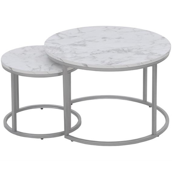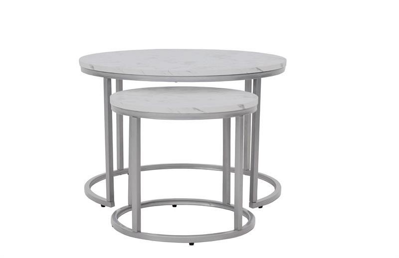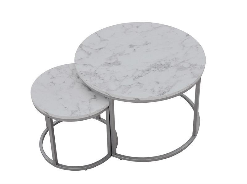 Zestaw 2 ławek PAOLA posiada płytę MDF pokrytą białym marmurem, metalowe podstawy pokryte srebrną farbą proszkową, które są bardzo odporne na uszkodzenia mechaniczne i korozję. Stół MDF jest odporny na zarysowania i zużycie. Atrakcyjny biały marmurowy kolor ze srebrną podstawą tworzy niezwykły duet, który idealnie sprawdzi się w eleganckich wnętrzach. Zestaw 2 stolików PAOLA to świetny zestaw, idealny na stolik kawowy obok sofy i fotela. Ława do salonu to mebel codziennego użytku, w którym odpoczywamy, pijemy kawę, rozmawiamy z bliskimi, spotykamy się z przyjaciółmi. Na blacie możemy położyć kubki, talerze, pilota, książkę do czytania. Stolik kawowy Oreo to wspaniały industrialny akcent, który doda wnętrzu oryginalnego designu.