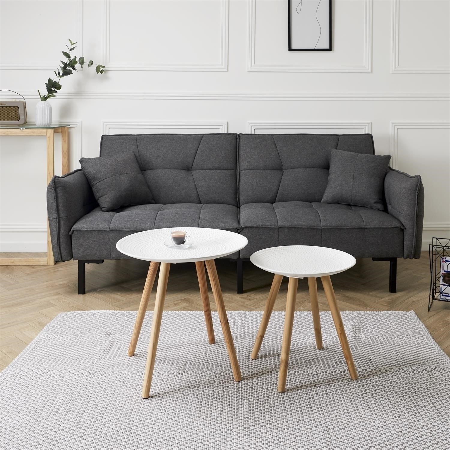 Zestawy dwóch okrągłych stolików w wersji biały/naturalny oraz czarny/naturalny to idealne rozwiązanie do nowoczesnych wnętrz. Ich minimalistyczny design i drewniane wykończenie sprawiają, że doskonale komponują się z różnymi aranżacjami. Idealne do salonu, sypialni czy kącika wypoczynkowego.