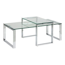 Zestaw 2 stolików kawowych Katrine Transparentny to nowoczesne i eleganckie wyposażenie.Stolniki wykonane są z wytrzymałego szkła, które jest przezroczyste, co nadaje im minimalistyczny wygląd. Stolniki są wyposażone w metalowe, srebrne nogi, które dodają im elegancji i solidności. Zestaw składa się z dwóch stolików w różnych rozmiarach, co pozwala na różnorodne aranżacje i elastyczność w użytkowaniu. Idealne do serwowania napojów, jako miejsce na książki czy dekoracje, a także jako element, który dodaje lekkości pomieszczeniu.