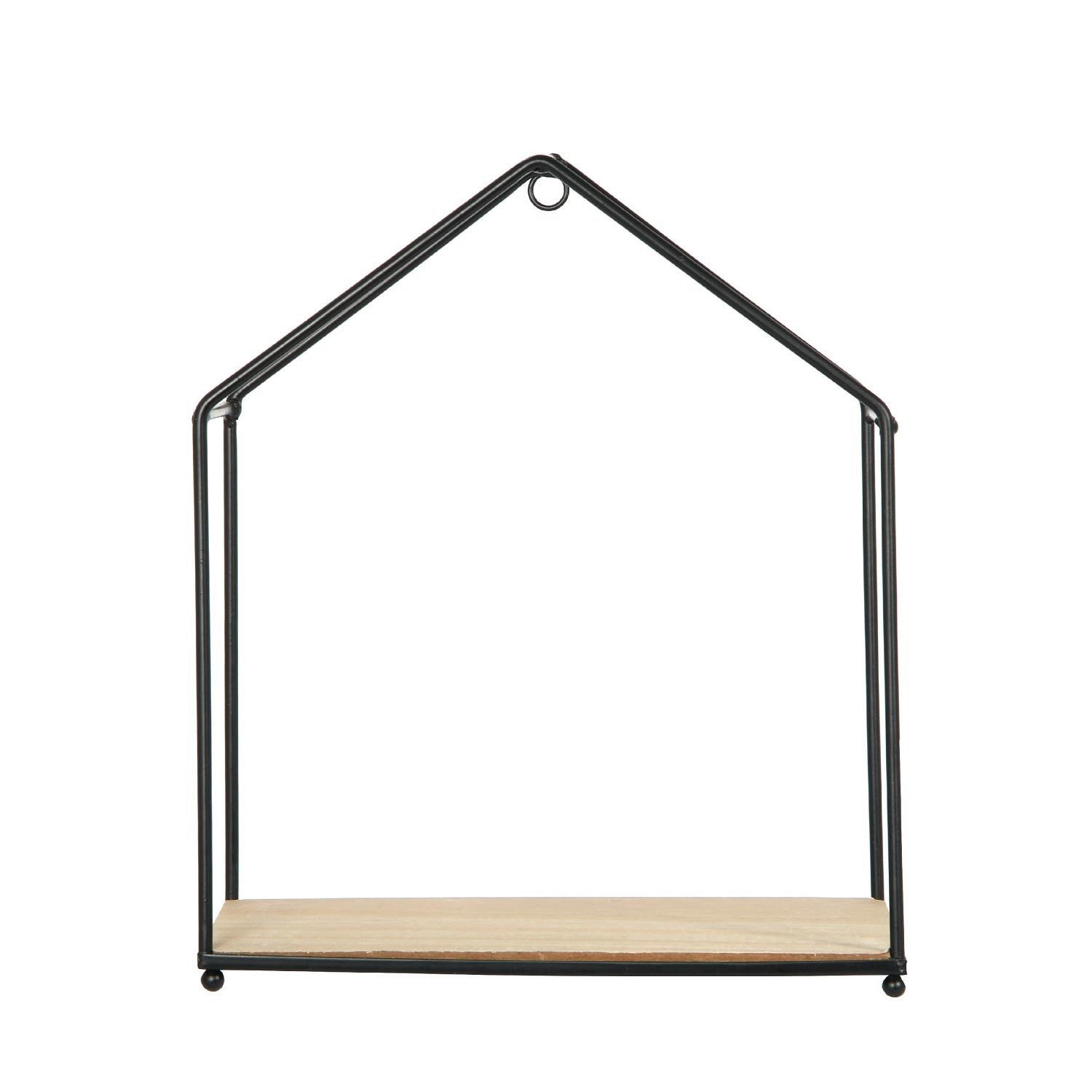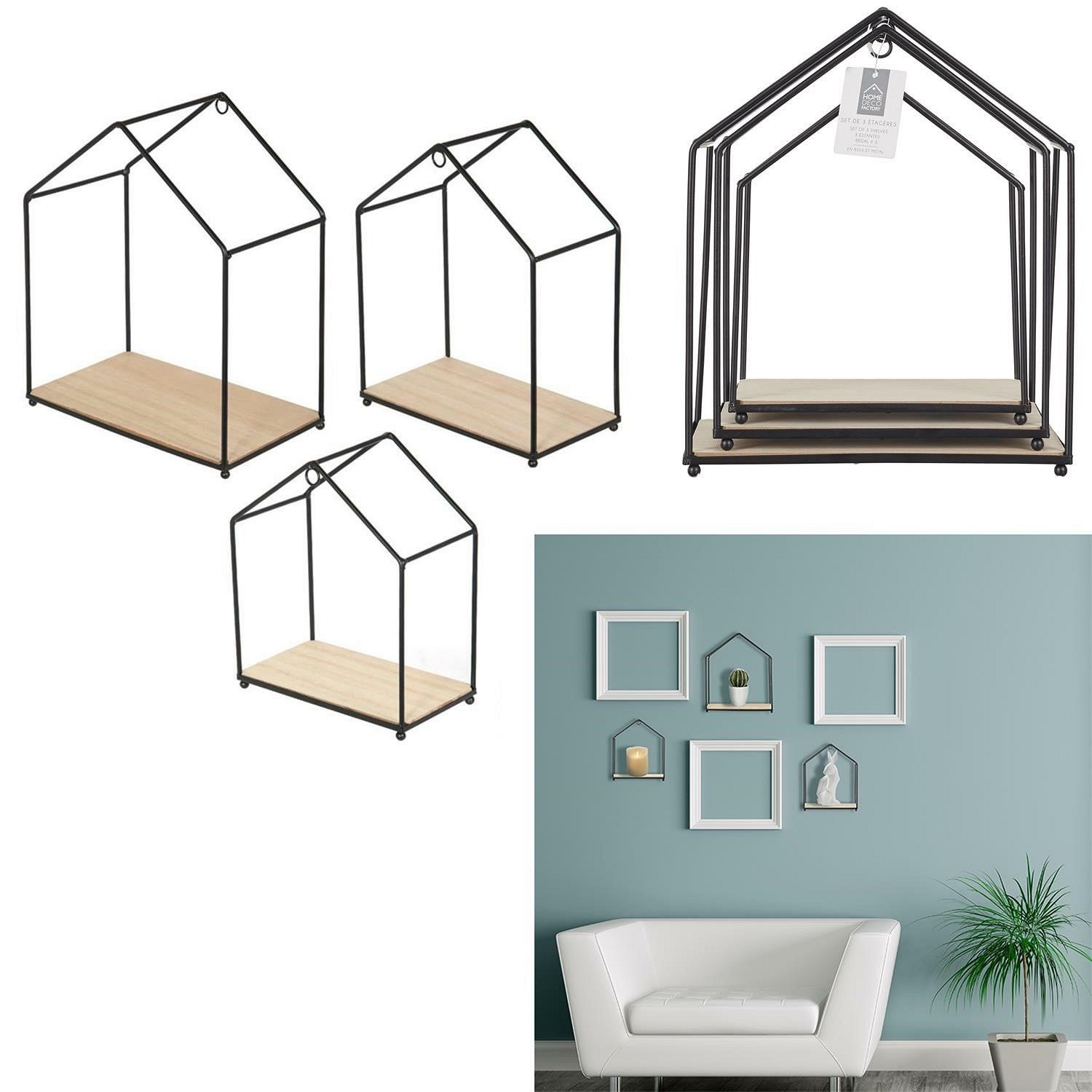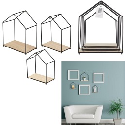 Podążaj za przewodowym i industrialnym trendem dzięki tym trzem półką w kształcie domu! Modele te wykonane są z ddrewnianej płyty MDF i metalu. Wprowadzą dekoracyjną i oryginalną nutę do Twojego wnętrza, jednocześnie umożliwiając przechowywanie ulubionych książek, kwiatów lub niektórych osobistych przedmiotów do wyeksponowania. Szczegół: Konstrukcja do zakładania lub mocowania - Wymiary: 23x27x13 cm - 20x24x11 cm - 17,5x20,5x9,5 cm. Wymiary kartonu: 31 x 29 x 47 cm