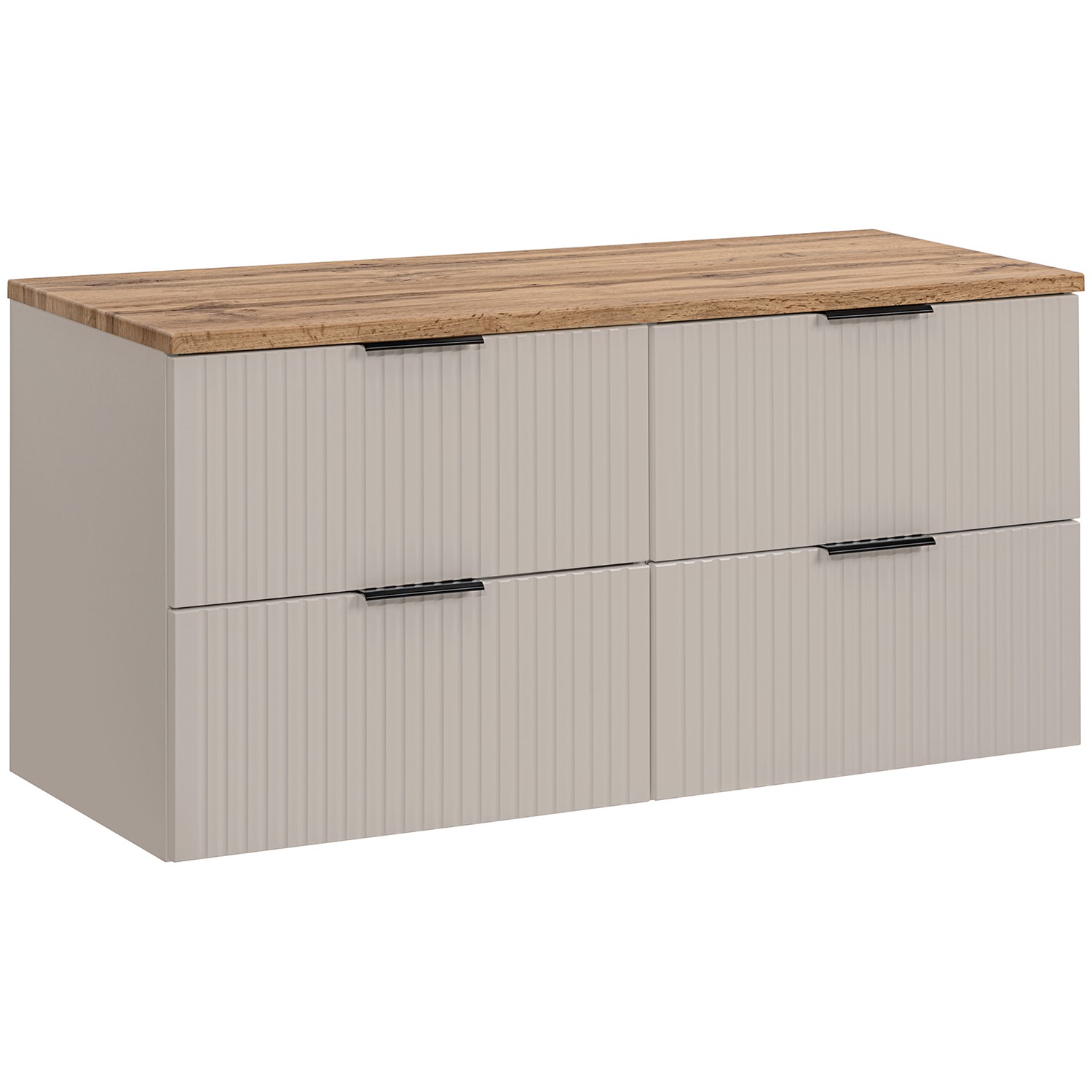 Prezentowana kolekcja mebli to nowoczesne połączenie elegancji i funkcjonalności, zaprojektowane z myślą o najbardziej wymagających użytkownikach. Wyróżnia się unikalnymi pionowymi frezowaniami we frontach i korpusie, które nadają meblom niepowtarzalny charakter i dynamikę. Dzięki tej wyjątkowej strukturze, meble wprowadzają do łazienki ruch i płynność, tworząc harmonijną i stylową przestrzeń. Nowoczesna kolorystyka oraz wyrafinowane detale czynią ją wyjątkową propozycją do każdej łazienki. Zestawy mebli wykonane są z wysokiej jakości materiałów, takich jak płyta laminowana i MDF, co zapewnia ich trwałość i odporność na wilgoć. Starannie dobrane komponenty oraz precyzyjne wykończenie gwarantują, że meble te będą służyć przez wiele lat, zachowując swój piękny wygląd i funkcjonalność. W zestawie znajdują się dwie szafki z blatem.