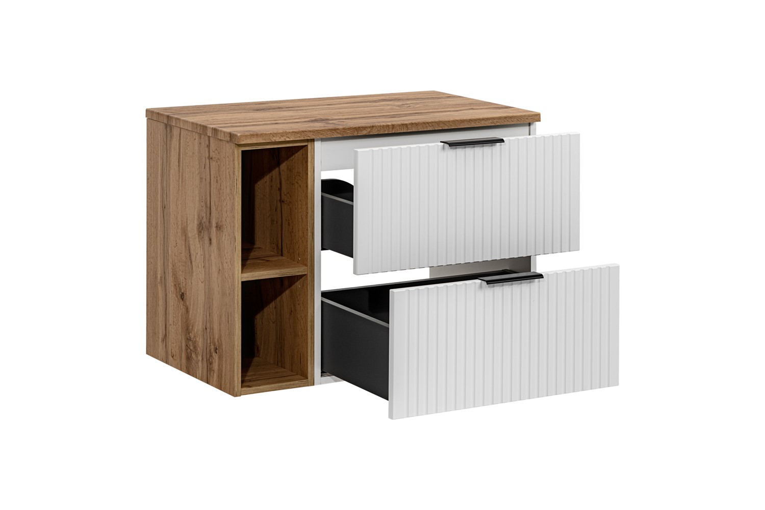 Nowa kolekcja mebli w kolorze Białym to synonim elegancji i funkcjonalności. Zaprojektowana z myślą o uniwersalnym zastosowaniu, doskonale sprawdza się zarówno w nowoczesnych, jak i klasycznych aranżacjach wnętrz. Charakteryzują się wysoką jakością wykonania oraz wyjątkową funkcjonalnością, zapewniając komfort użytkowania nawet najbardziej wymagającym klientom. Meble wyróżniają się klasycznymi proporcjami brył i frezowanymi pionowo frontami, które nadają meblom unikalny i elegancki charakter. Dzięki prostym liniom i wyrafinowanym wykończeniom, meble z tej kolekcji idealnie wpisują się w różnorodne style dekoracyjne, od minimalistycznych po bardziej tradycyjne. W zestawie znajduje się szafka z blatem oraz regał.