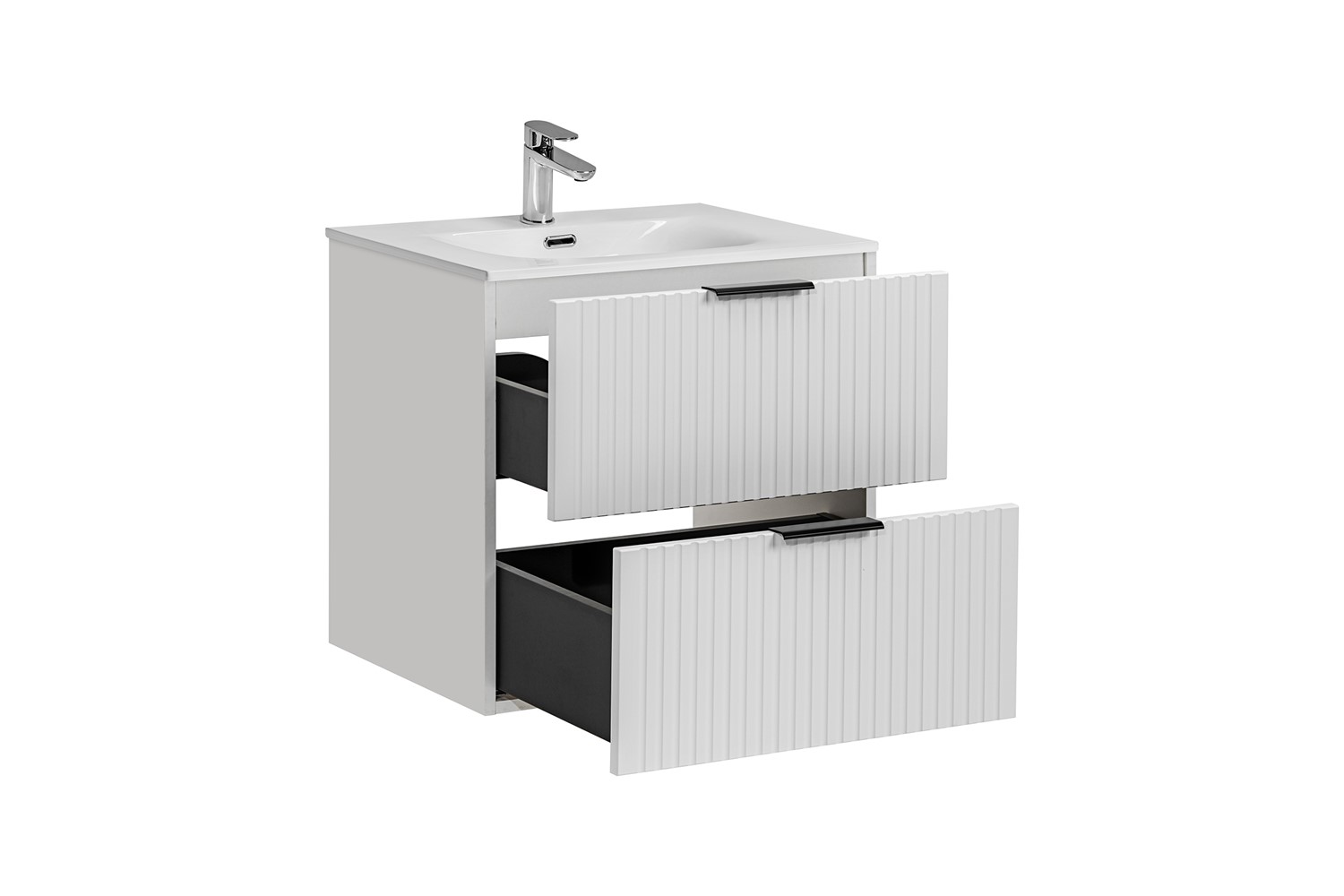 Nowa kolekcja mebli w kolorze Białym to synonim elegancji i funkcjonalności. Zaprojektowana z myślą o uniwersalnym zastosowaniu, doskonale sprawdza się zarówno w nowoczesnych, jak i klasycznych aranżacjach wnętrz. Charakteryzują się wysoką jakością wykonania oraz wyjątkową funkcjonalnością, zapewniając komfort użytkowania nawet najbardziej wymagającym klientom. Prezentowana kolekcja wyróżnia się klasycznymi proporcjami brył i frezowanymi pionowo frontami, które nadają meblom unikalny i elegancki charakter. Dębowy kolor dodaje wnętrzom ciepła i naturalnego uroku, tworząc przytulną atmosferę. W zestawie znajduje się szafka z umywalką.