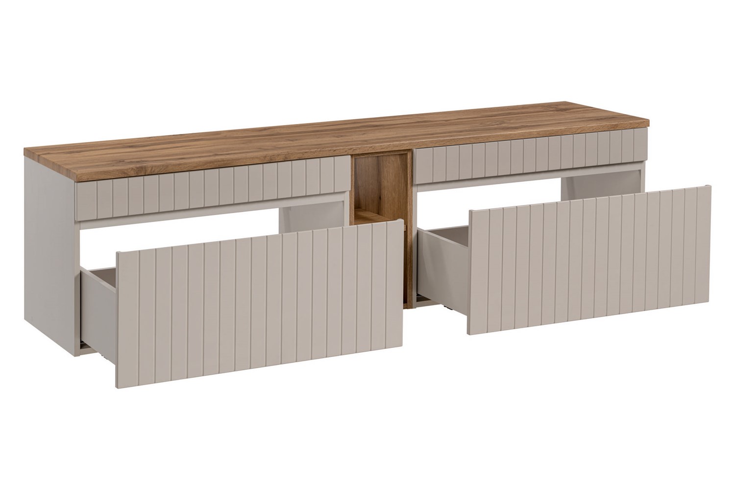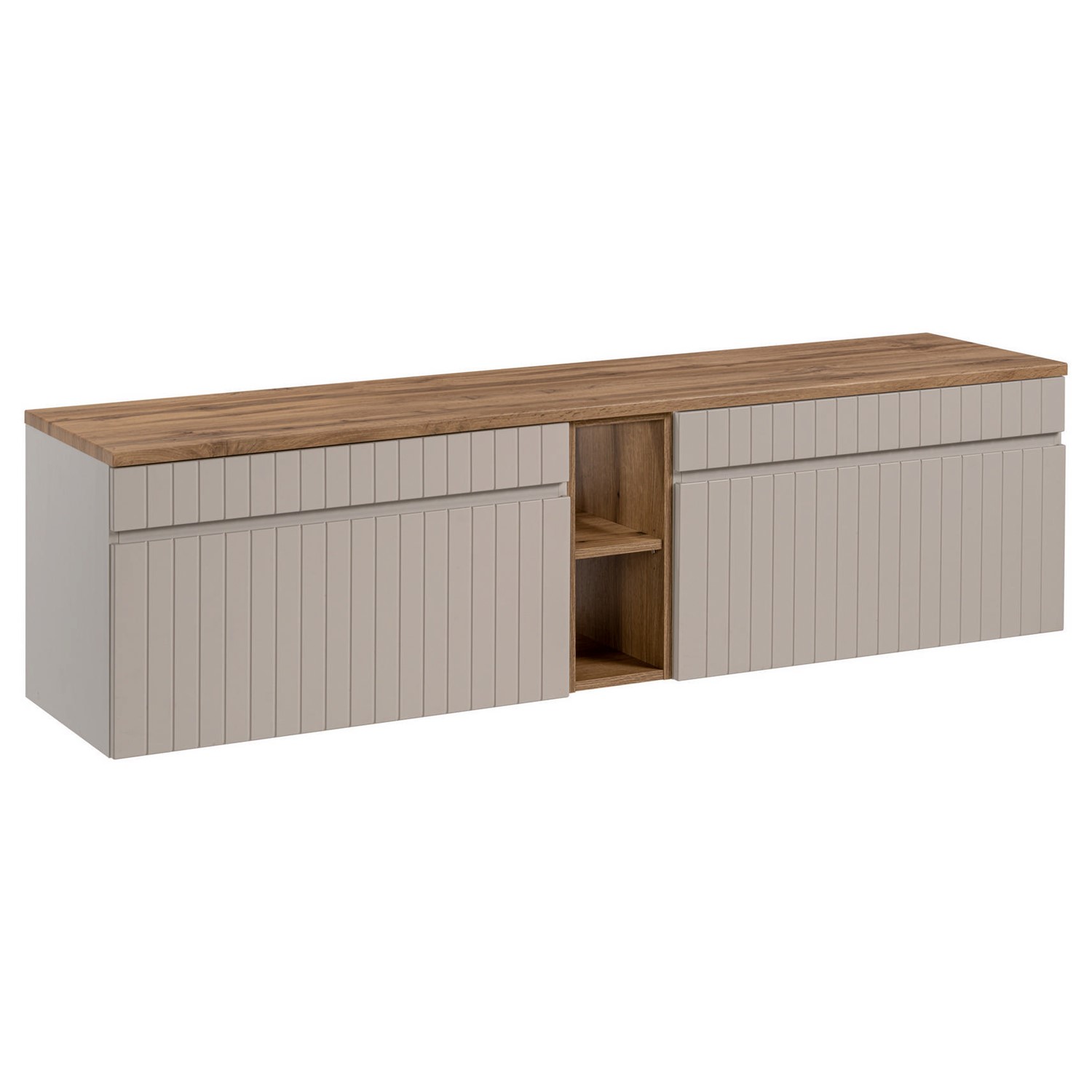 Zestaw szafek z blatem i regałem to idealne rozwiązanie dla osób ceniących elegancję oraz praktyczne wykorzystanie przestrzeni. Ryflowane fronty są szczególnie atrakcyjnym i wszechstronnym elementem wzorniczym, który nadaje meblom unikalny charakter. Wykonana jest z najwyższej jakości materiałów, które gwarantują trwałość i odporność na codzienne użytkowanie. Solidna konstrukcja z płyty laminowanej oraz staranne wykończenie sprawiają, że mebel ten posłuży przez wiele lat, zachowując swój elegancki wygląd. Nowoczesna kolorystyka w odcieniu kaszmirowym jest odpowiedzią na zmieniające się trendy oraz wyszukane potrzeby wizualne klientów.