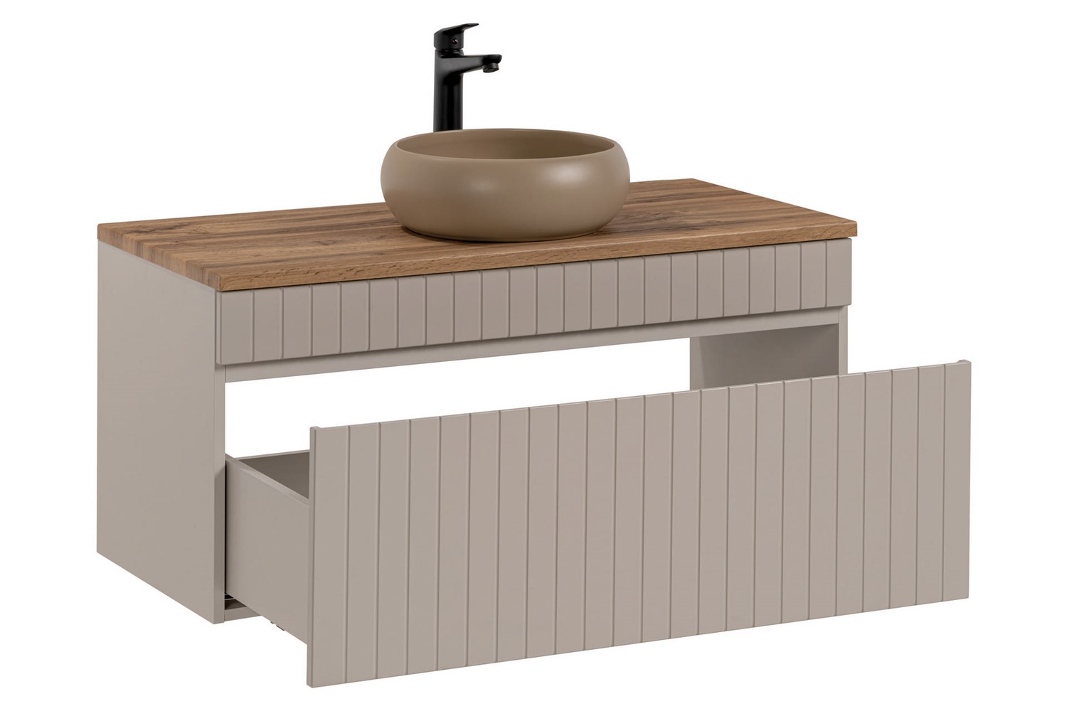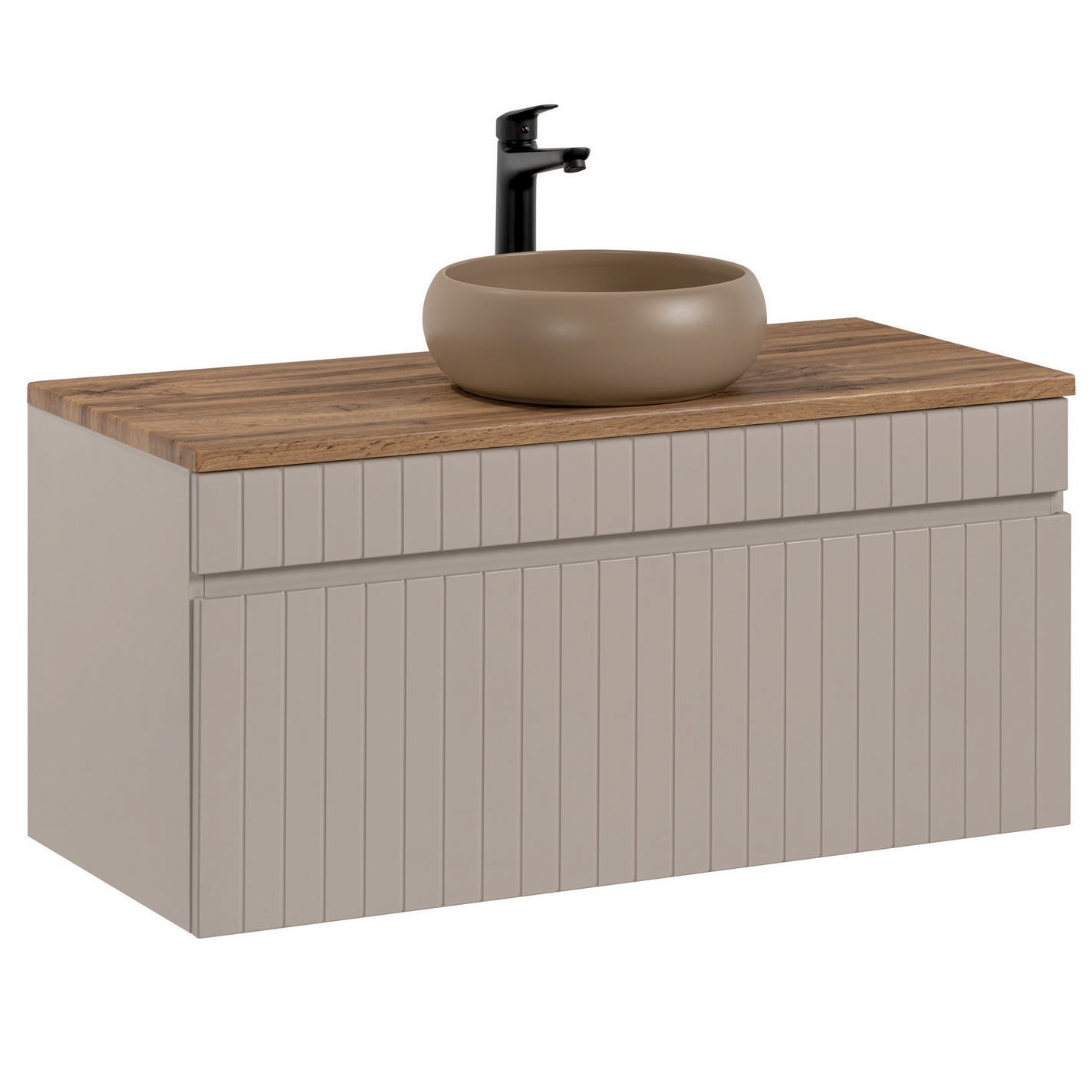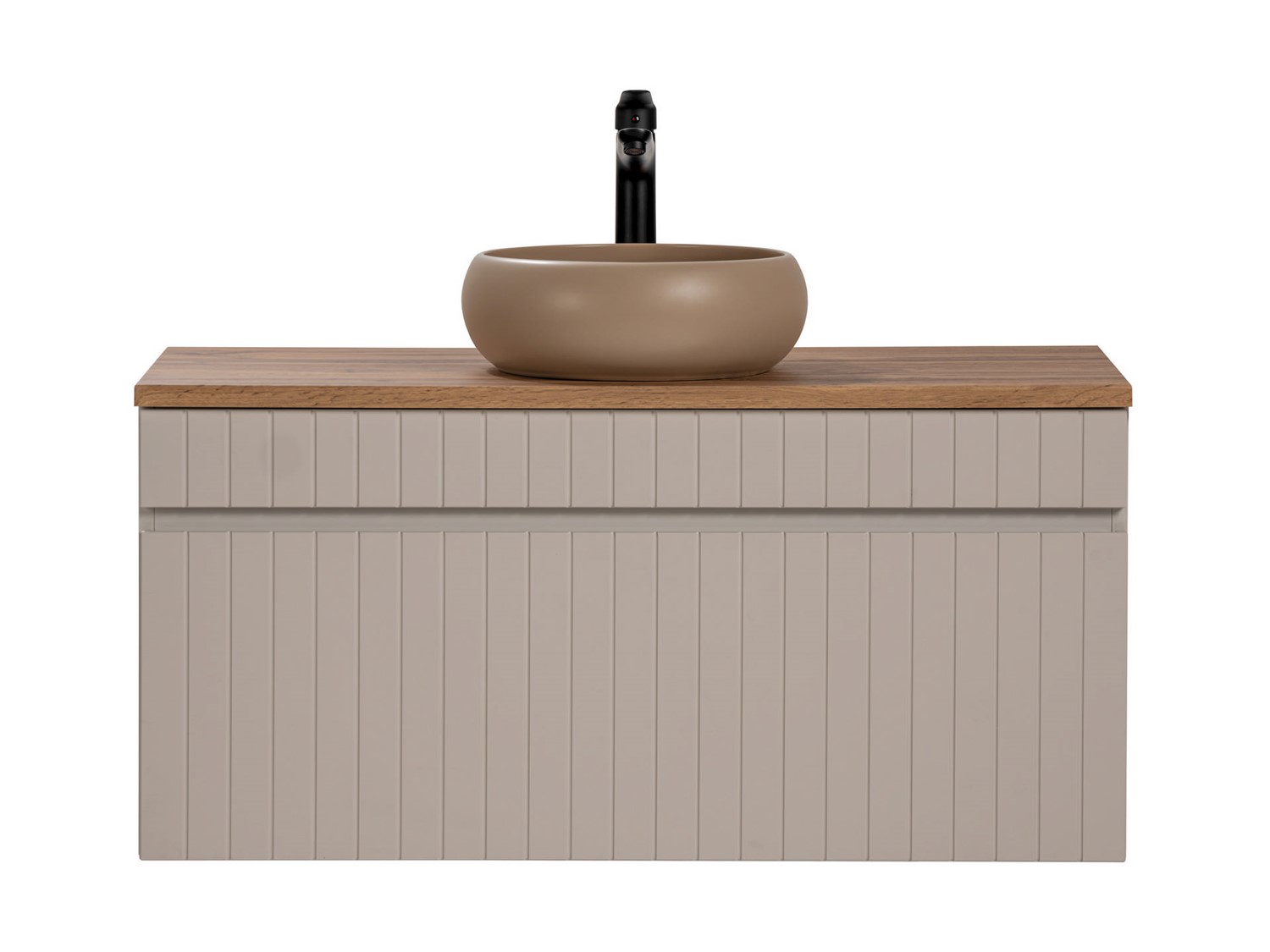 Zestaw szafki z blatem i umywalką to idealne rozwiązanie dla osób ceniących elegancję oraz praktyczne wykorzystanie przestrzeni. Ryflowane fronty są szczególnie atrakcyjnym i wszechstronnym elementem wzorniczym, który nadaje meblom unikalny charakter. Wykonana jest z najwyższej jakości materiałów, które gwarantują trwałość i odporność na codzienne użytkowanie. Solidna konstrukcja z płyty laminowanej oraz staranne wykończenie sprawiają, że mebel ten posłuży przez wiele lat, zachowując swój elegancki wygląd. Nowoczesna kolorystyka w odcieniu kaszmirowym jest odpowiedzią na zmieniające się trendy oraz wyszukane potrzeby wizualne klientów.