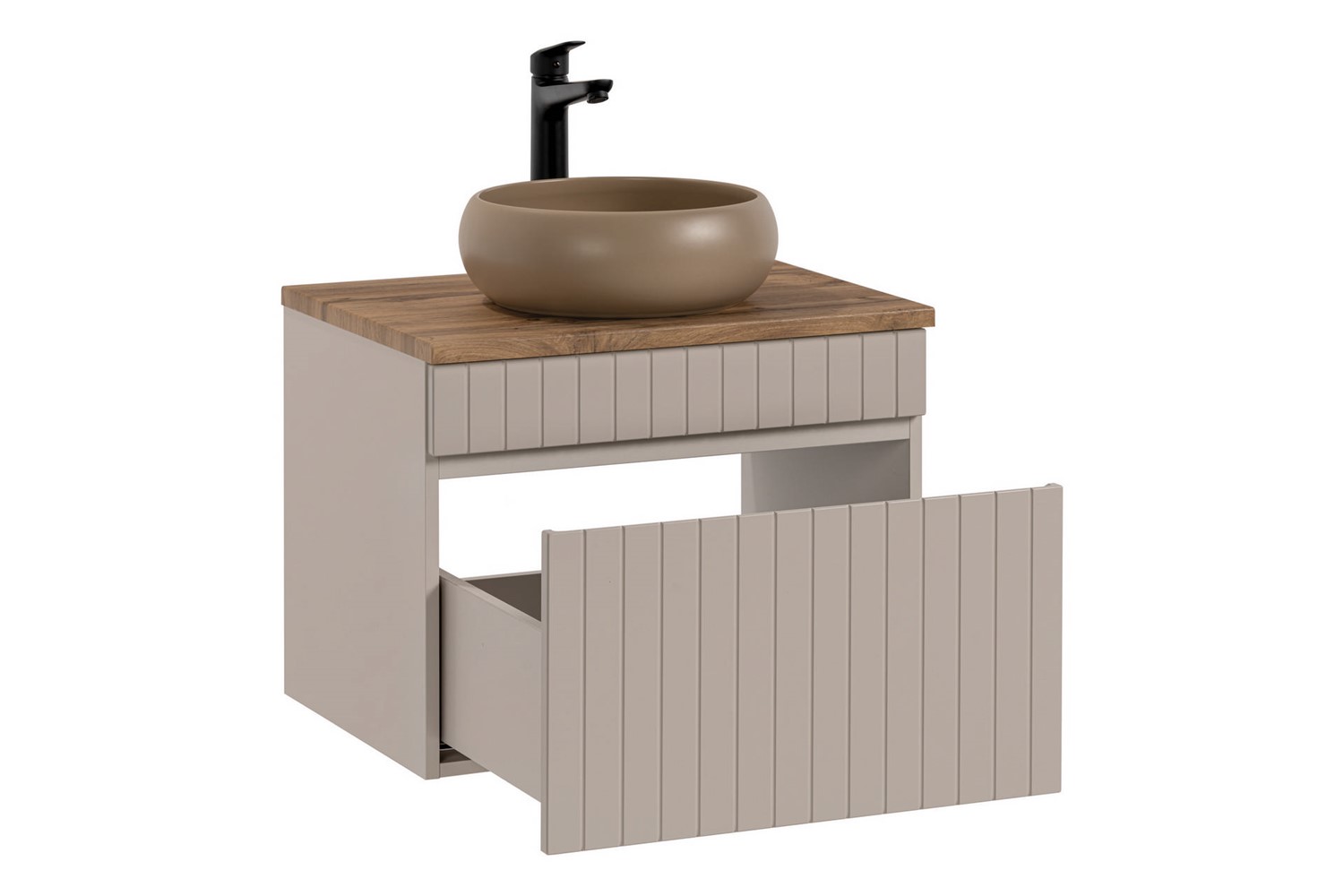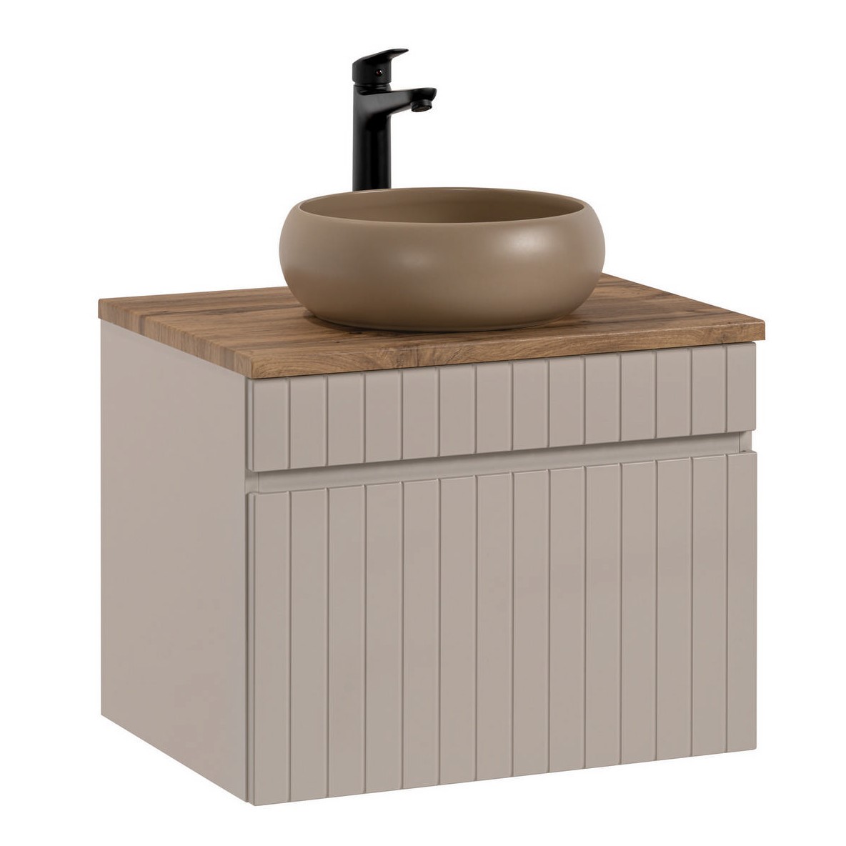 Zestaw szafki z blatem i umywalką to idealne rozwiązanie dla osób ceniących elegancję oraz praktyczne wykorzystanie przestrzeni. Ryflowane fronty są szczególnie atrakcyjnym i wszechstronnym elementem wzorniczym, który nadaje meblom unikalny charakter. Wykonana jest z najwyższej jakości materiałów, które gwarantują trwałość i odporność na codzienne użytkowanie. Solidna konstrukcja z płyty laminowanej oraz staranne wykończenie sprawiają, że mebel ten posłuży przez wiele lat, zachowując swój elegancki wygląd. Nowoczesna kolorystyka w odcieniu kaszmirowym jest odpowiedzią na zmieniające się trendy oraz wyszukane potrzeby wizualne klientów.