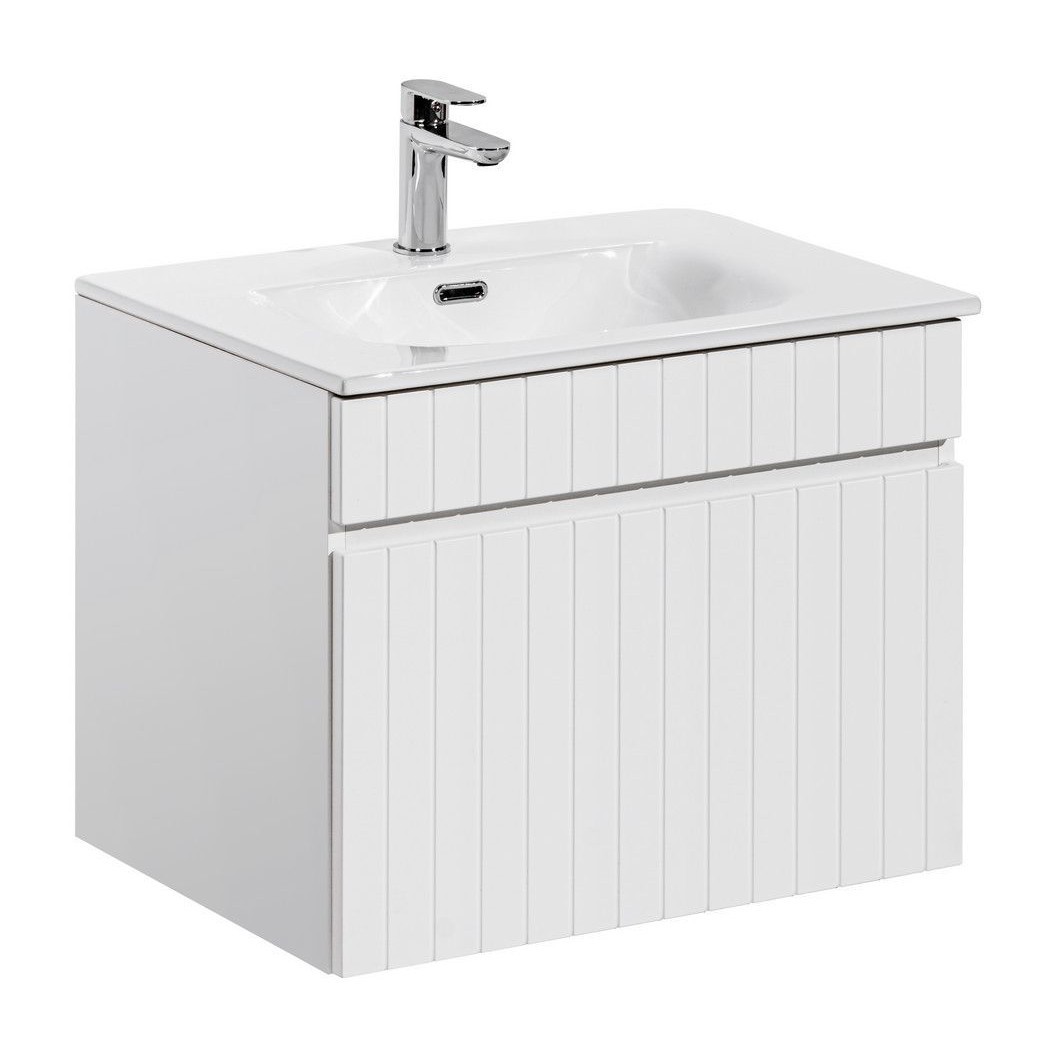 Prezentowana kolekcja mebli to nowoczesne połączenie elegancji i funkcjonalności, zaprojektowane z myślą o najbardziej wymagających użytkownikach. Wyróżnia się unikalnymi pionowymi frezowaniami we frontach i korpusie, które nadają meblom niepowtarzalny charakter i dynamikę. Dzięki tej wyjątkowej strukturze, meble wprowadzają do łazienki ruch i płynność, tworząc harmonijną i stylową przestrzeń. Nowoczesna kolorystyka oraz wyrafinowane detale czynią ją wyjątkową propozycją do każdej łazienki. Zestawy mebli wykonane są z wysokiej jakości materiałów, takich jak płyta laminowana i MDF, co zapewnia ich trwałość i odporność na wilgoć. Starannie dobrane komponenty oraz precyzyjne wykończenie gwarantują, że meble te będą służyć przez wiele lat, zachowując swój piękny wygląd i funkcjonalność. W zestawie znajduje się szafka z umywalką.