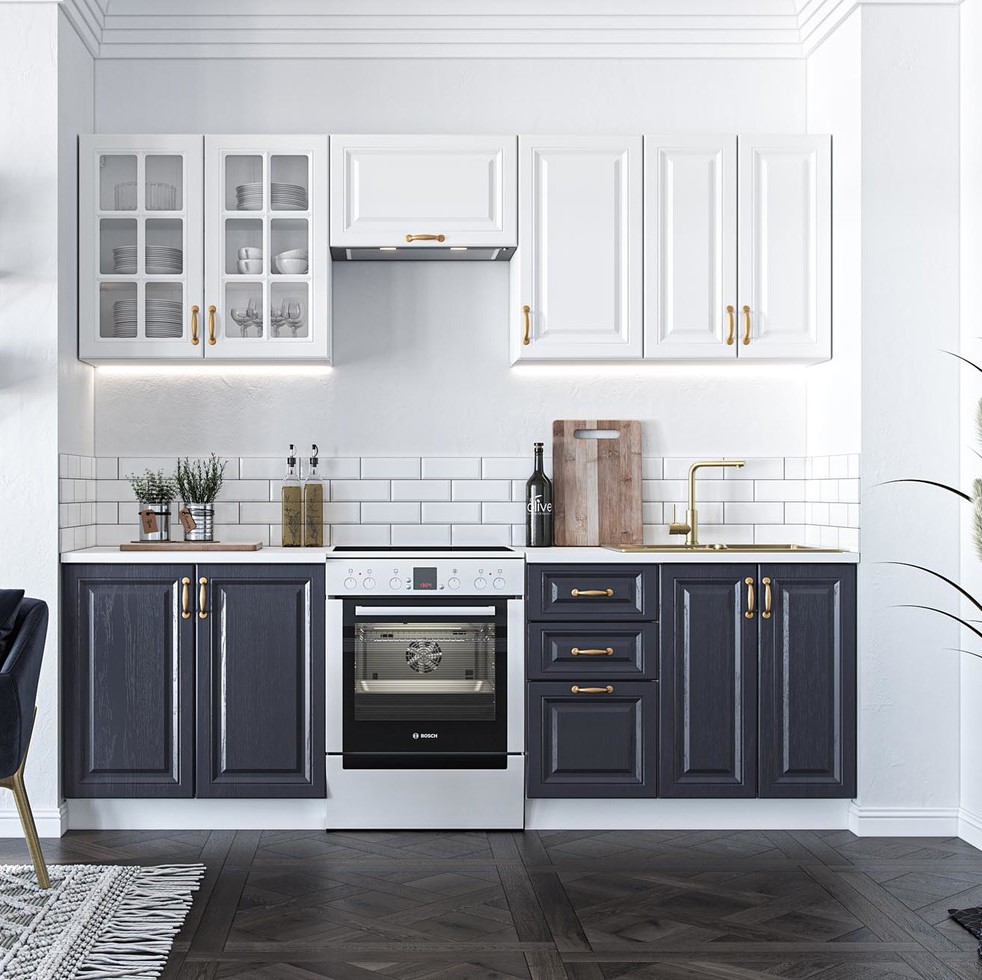 Górne szafki w kolorze białym dodają lekkości i optycznie powiększają przestrzeń, natomiast dolne w głębokim granacie nadają wnętrzu charakteru. Złote uchwyty to doskonały akcent, który dodaje luksusu i subtelnej finezji do całego zestawu.