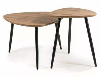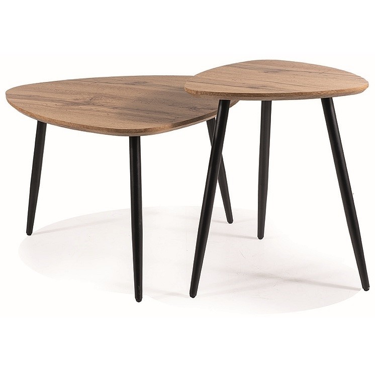 Zestaw ław Twin to elegancki komplet o różnej wielkości, idealny do nowoczesnych wnętrz. Blaty wykonane z MDF pokryte okleiną w kolorze dąb artisan doskonale komponują się z metalowymi stelażami w czarnym macie, tworząc stylową i funkcjonalną całość.