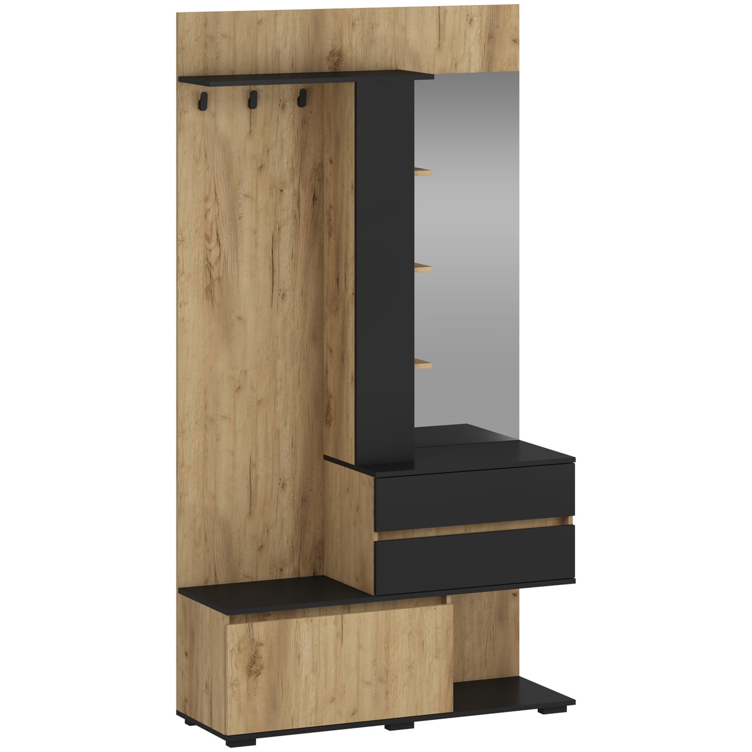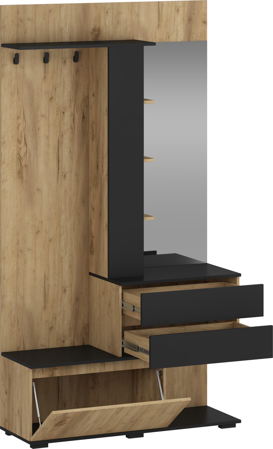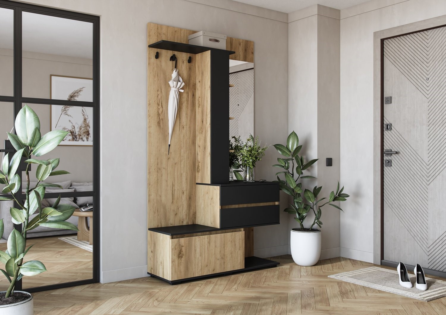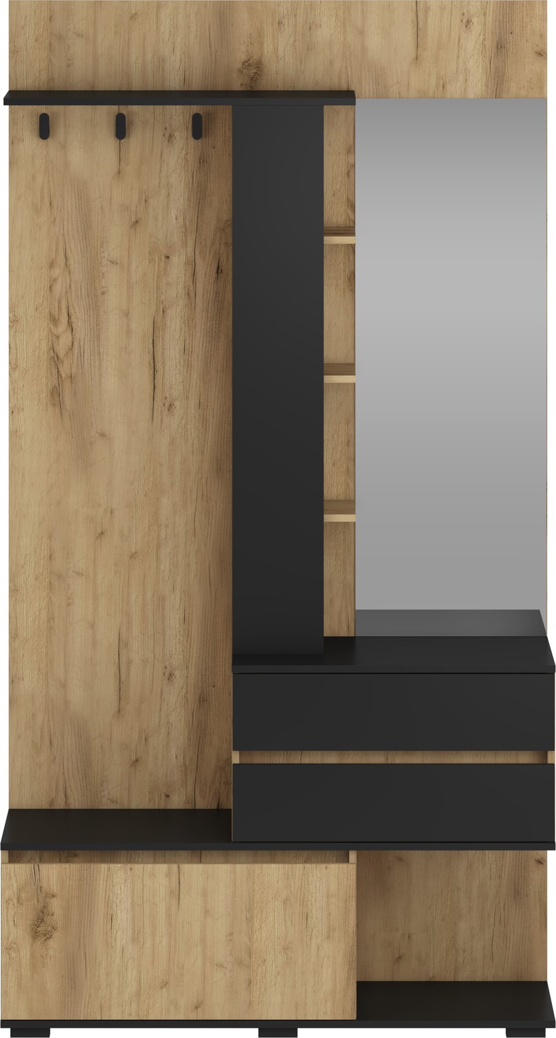 Prezentowany zestaw mebli do przedpokoju to praktyczne i funkcjonalne rozwiązanie, które pozwala uporządkować przestrzeń już przy wejściu do domu. Dzięki kompaktowej konstrukcji zestaw sprawdzi się zarówno w małych, jak i większych przedpokojach. Nowoczesny design sprawia, że meble stanowią także estetyczny element aranżacji wnętrza. Wykonane z trwałych materiałów są odporne na codzienne użytkowanie i łatwe w utrzymaniu czystości. Dodatkowe półki i schowki umożliwiają przechowywanie akcesoriów, takich jak czapki, szaliki czy torby. Zestaw mebli pomaga utrzymać porządek i tworzy funkcjonalną strefę wejściową w każdym domu.