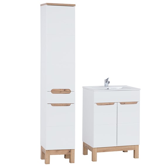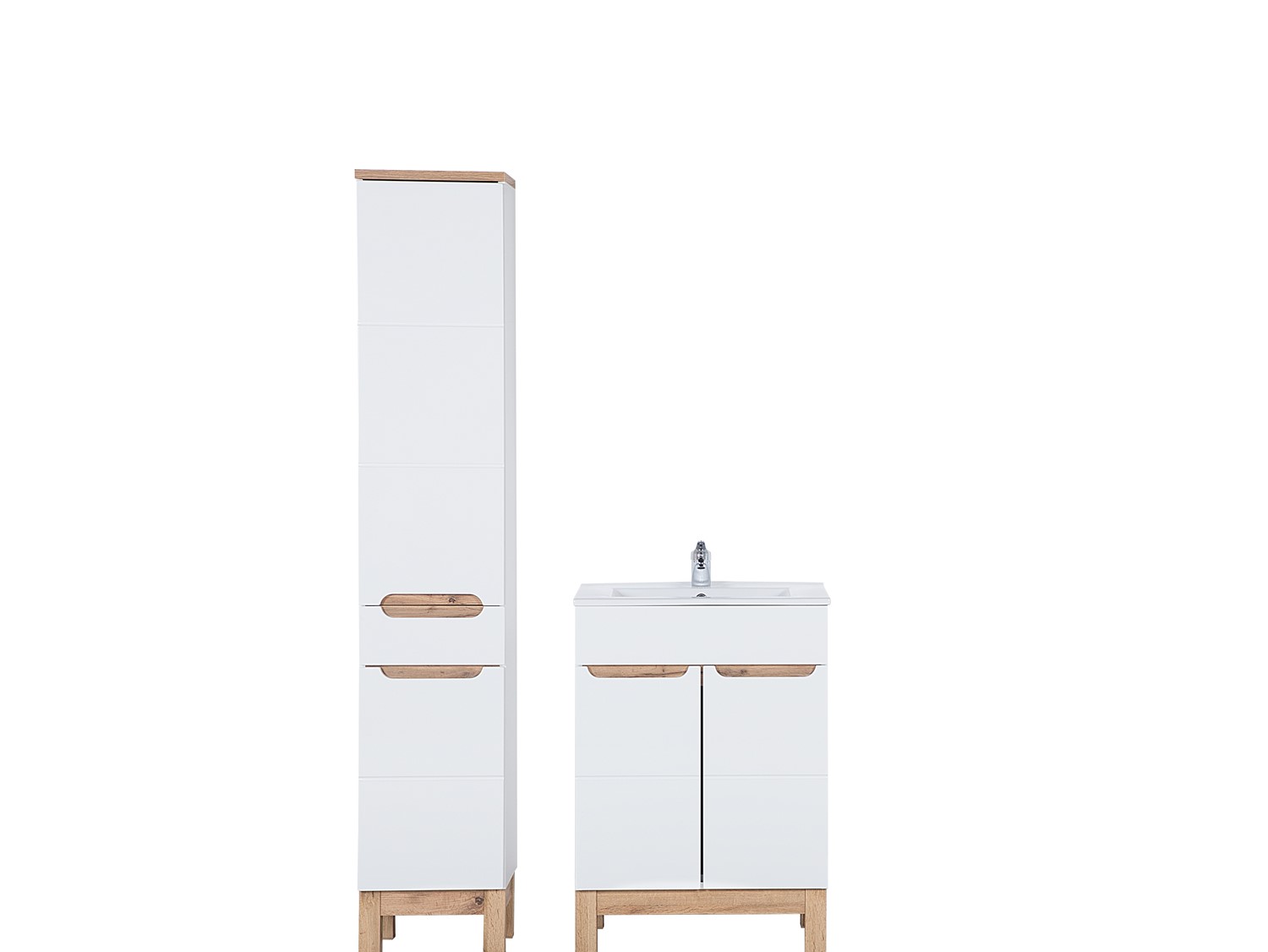 Prezentowana kolekcja mebli to esencja elegancji i funkcjonalności, idealna dla osób pragnących wprowadzić do swojej łazienki unikalny, stylowy klimat. Piękne, frezowane fronty nadają pomieszczeniu niepowtarzalny, przytulny klimat. Połączenie naturalnego drewna z białymi elementami tworzy harmonijny, ponadczasowy wygląd, który doskonale wpisuje się zarówno w nowoczesne, jak i klasyczne aranżacje łazienkowe. Solidne korpusy mebli gwarantują ich trwałość i odporność na codzienne użytkowanie. Wysokiej jakości materiały zapewniają, że meble będą służyć przez wiele lat, zachowując swój piękny wygląd i funkcjonalność.