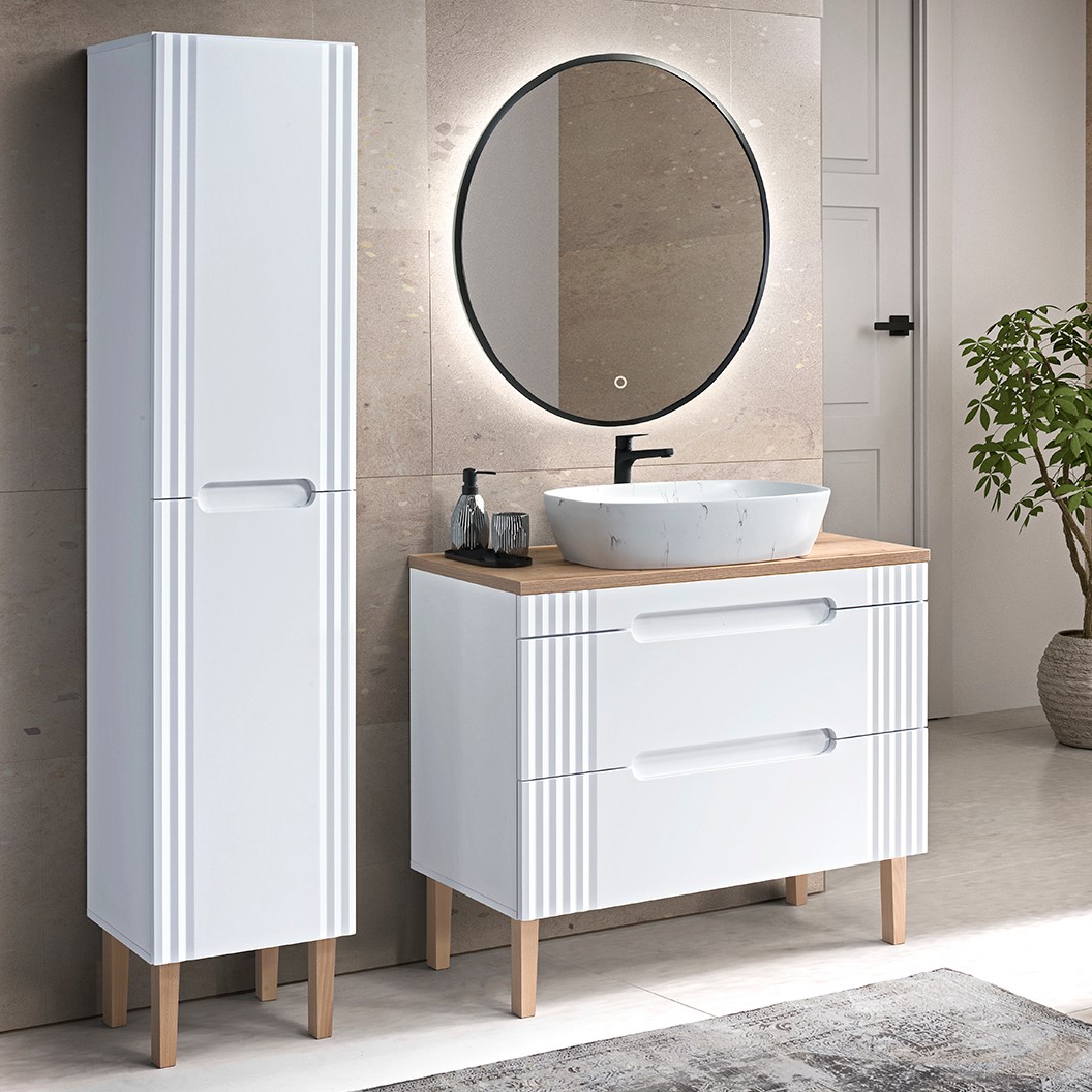Prezentowana kolekcja mebli to esencja elegancji i funkcjonalności, idealna dla osób pragnących wprowadzić do swojej łazienki unikalny, stylowy klimat. Piękne, frezowane fronty nadają pomieszczeniu niepowtarzalny, przytulny klimat. Połączenie naturalnego drewna z białymi elementami tworzy harmonijny, ponadczasowy wygląd, który doskonale wpisuje się zarówno w nowoczesne, jak i klasyczne aranżacje łazienkowe. Solidne korpusy mebli gwarantują ich trwałość i odporność na codzienne użytkowanie. Wysokiej jakości materiały zapewniają, że meble będą służyć przez wiele lat, zachowując swój piękny wygląd i funkcjonalność.