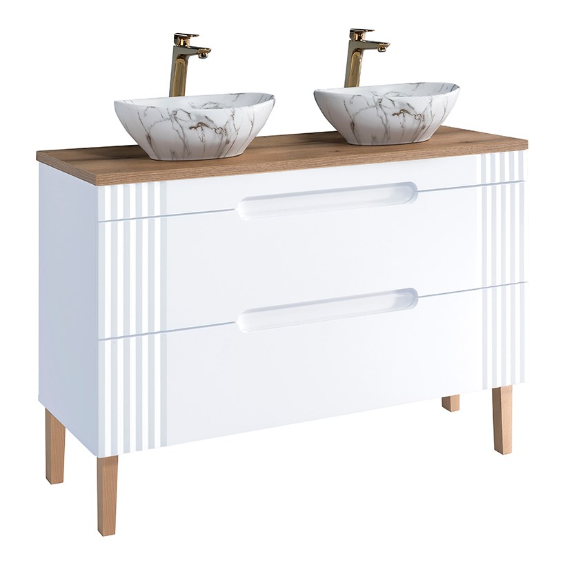Prezentowana kolekcja mebli to esencja elegancji i funkcjonalności, idealna dla osób pragnących wprowadzić do swojej łazienki unikalny, stylowy klimat. Piękne, frezowane fronty nadają pomieszczeniu niepowtarzalny, przytulny klimat. Połączenie naturalnego drewna z białymi elementami tworzy harmonijny, ponadczasowy wygląd, który doskonale wpisuje się zarówno w nowoczesne, jak i klasyczne aranżacje łazienkowe. Solidne korpusy mebli gwarantują ich trwałość i odporność na codzienne użytkowanie. Wysokiej jakości materiały zapewniają, że meble będą służyć przez wiele lat, zachowując swój piękny wygląd i funkcjonalność.