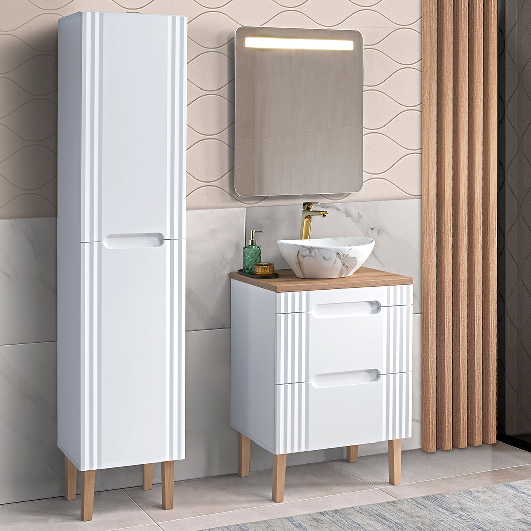 Prezentowana kolekcja mebli to esencja elegancji i funkcjonalności, idealna dla osób pragnących wprowadzić do swojej łazienki unikalny, stylowy klimat. Piękne, frezowane fronty nadają pomieszczeniu niepowtarzalny, przytulny klimat. Połączenie naturalnego drewna z białymi elementami tworzy harmonijny, ponadczasowy wygląd, który doskonale wpisuje się zarówno w nowoczesne, jak i klasyczne aranżacje łazienkowe. Solidne korpusy mebli gwarantują ich trwałość i odporność na codzienne użytkowanie. Wysokiej jakości materiały zapewniają, że meble będą służyć przez wiele lat, zachowując swój piękny wygląd i funkcjonalność.