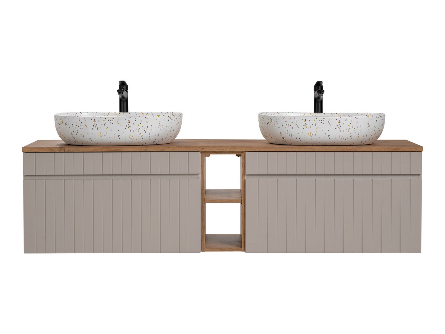 Zestaw szafek z blatem, regałem i umywalkami to idealne rozwiązanie dla osób ceniących elegancję oraz praktyczne wykorzystanie przestrzeni. Ryflowane fronty są szczególnie atrakcyjnym i wszechstronnym elementem wzorniczym, który nadaje meblom unikalny charakter. Wykonana jest z najwyższej jakości materiałów, które gwarantują trwałość i odporność na codzienne użytkowanie. Solidna konstrukcja z płyty laminowanej oraz staranne wykończenie sprawiają, że mebel ten posłuży przez wiele lat, zachowując swój elegancki wygląd. Nowoczesna kolorystyka w odcieniu kaszmirowym jest odpowiedzią na zmieniające się trendy oraz wyszukane potrzeby wizualne klientów.