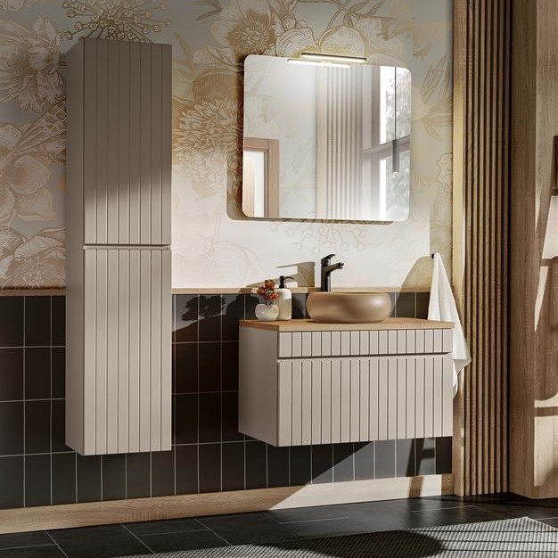 Zestaw szafek z blatem, umywalkami, słupkiem wysokim, lustrami oraz lampami led to idealne rozwiązanie dla osób ceniących elegancję oraz praktyczne wykorzystanie przestrzeni. Ryflowane fronty są szczególnie atrakcyjnym i wszechstronnym elementem wzorniczym, który nadaje meblom unikalny charakter. Wykonana jest z najwyższej jakości materiałów, które gwarantują trwałość i odporność na codzienne użytkowanie. Solidna konstrukcja z płyty laminowanej oraz staranne wykończenie sprawiają, że mebel ten posłuży przez wiele lat, zachowując swój elegancki wygląd. Nowoczesna kolorystyka w odcieniu kaszmirowym jest odpowiedzią na zmieniające się trendy oraz wyszukane potrzeby wizualne klientów.