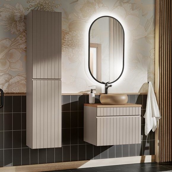 Zestaw mebli łazienkowych to idealne rozwiązanie dla osób ceniących elegancję oraz praktyczne wykorzystanie przestrzeni. W skład zestawu wchodzi szafka, blat, umywalka, słupek wysoki oraz lustro. Ryflowane fronty są szczególnie atrakcyjnym i wszechstronnym elementem wzorniczym, który nadaje meblom unikalny charakter. Wykonana jest z najwyższej jakości materiałów, które gwarantują trwałość i odporność na codzienne użytkowanie. Solidna konstrukcja z płyty laminowanej oraz staranne wykończenie sprawiają, że mebel ten posłuży przez wiele lat, zachowując swój elegancki wygląd. Nowoczesna kolorystyka w odcieniu kaszmirowym jest odpowiedzią na zmieniające się trendy oraz wyszukane potrzeby wizualne klientów.