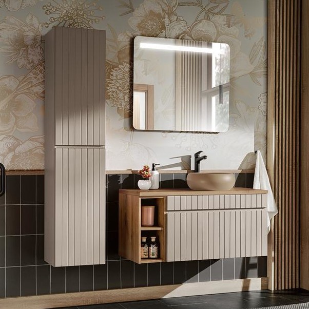 Zestaw mebli łazienkowych to idealne rozwiązanie dla osób ceniących elegancję oraz praktyczne wykorzystanie przestrzeni. W skład zestawu wchodzi szafka, blat, regał dolny, umywalka, słupek wysoki oraz lustro. Ryflowane fronty są szczególnie atrakcyjnym i wszechstronnym elementem wzorniczym, który nadaje meblom unikalny charakter. Wykonana jest z najwyższej jakości materiałów, które gwarantują trwałość i odporność na codzienne użytkowanie. Solidna konstrukcja z płyty laminowanej oraz staranne wykończenie sprawiają, że mebel ten posłuży przez wiele lat, zachowując swój elegancki wygląd. Nowoczesna kolorystyka w odcieniu kaszmirowym jest odpowiedzią na zmieniające się trendy oraz wyszukane potrzeby wizualne klientów.