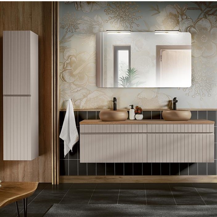 Zestaw szafek z blatem, umywalką, słupkiem wysokim, lustrem oraz lampami led to idealne rozwiązanie dla osób ceniących elegancję oraz praktyczne wykorzystanie przestrzeni. Ryflowane fronty są szczególnie atrakcyjnym i wszechstronnym elementem wzorniczym, który nadaje meblom unikalny charakter. Wykonana jest z najwyższej jakości materiałów, które gwarantują trwałość i odporność na codzienne użytkowanie. Solidna konstrukcja z płyty laminowanej oraz staranne wykończenie sprawiają, że mebel ten posłuży przez wiele lat, zachowując swój elegancki wygląd. Nowoczesna kolorystyka w odcieniu kaszmirowym jest odpowiedzią na zmieniające się trendy oraz wyszukane potrzeby wizualne klientów.