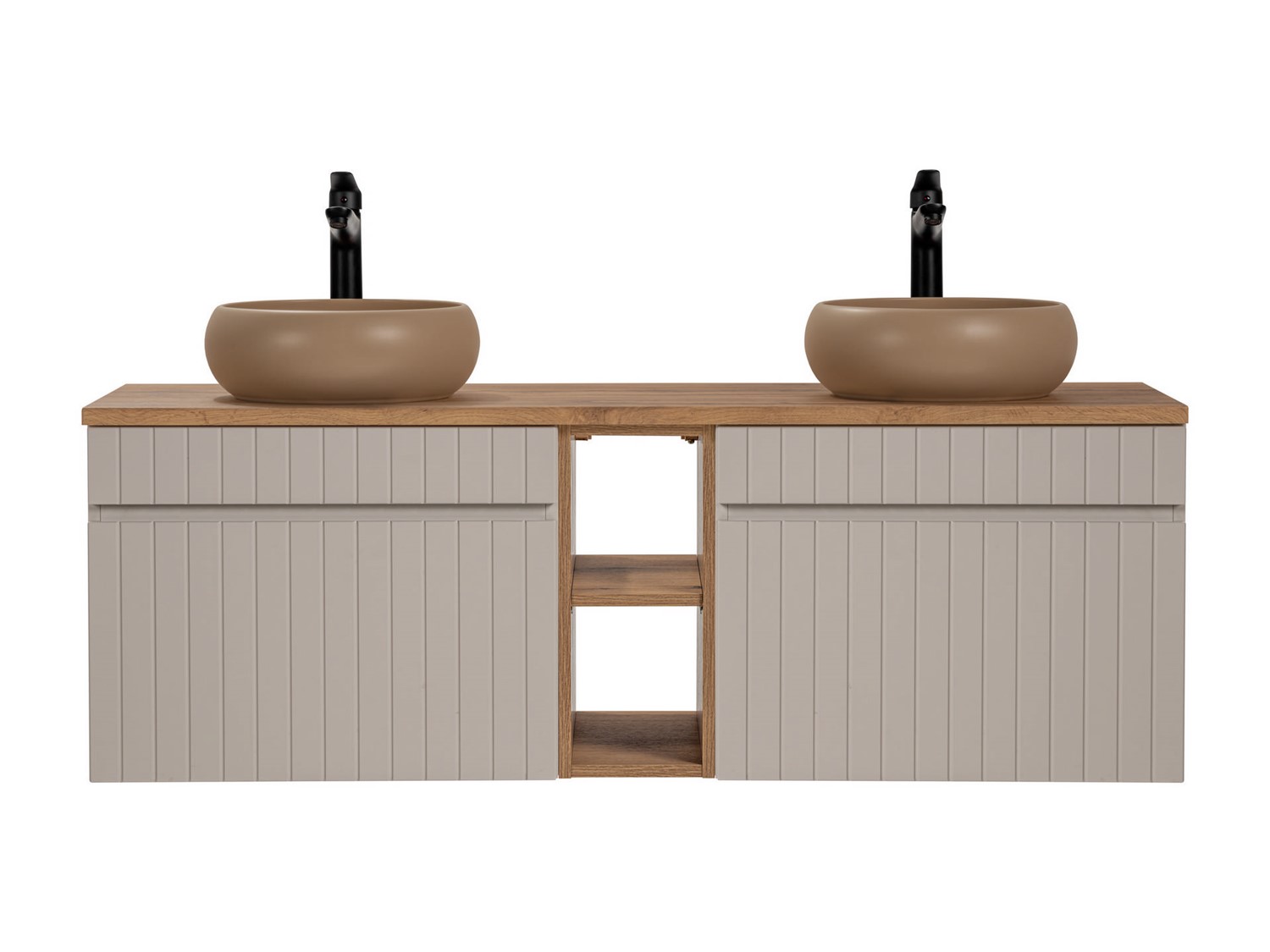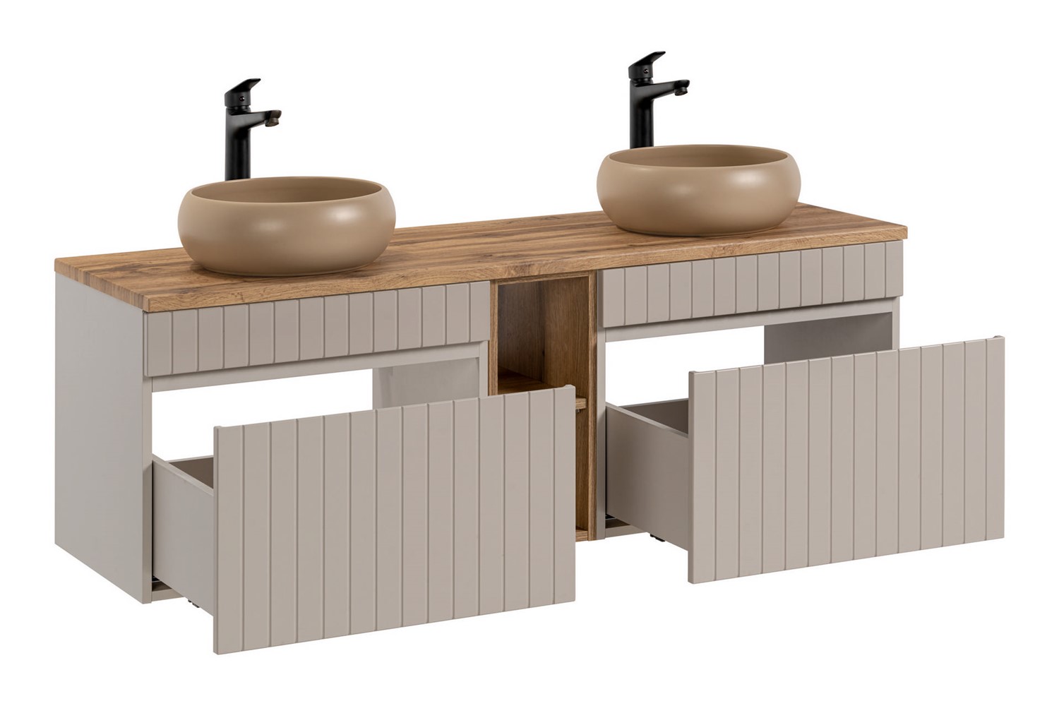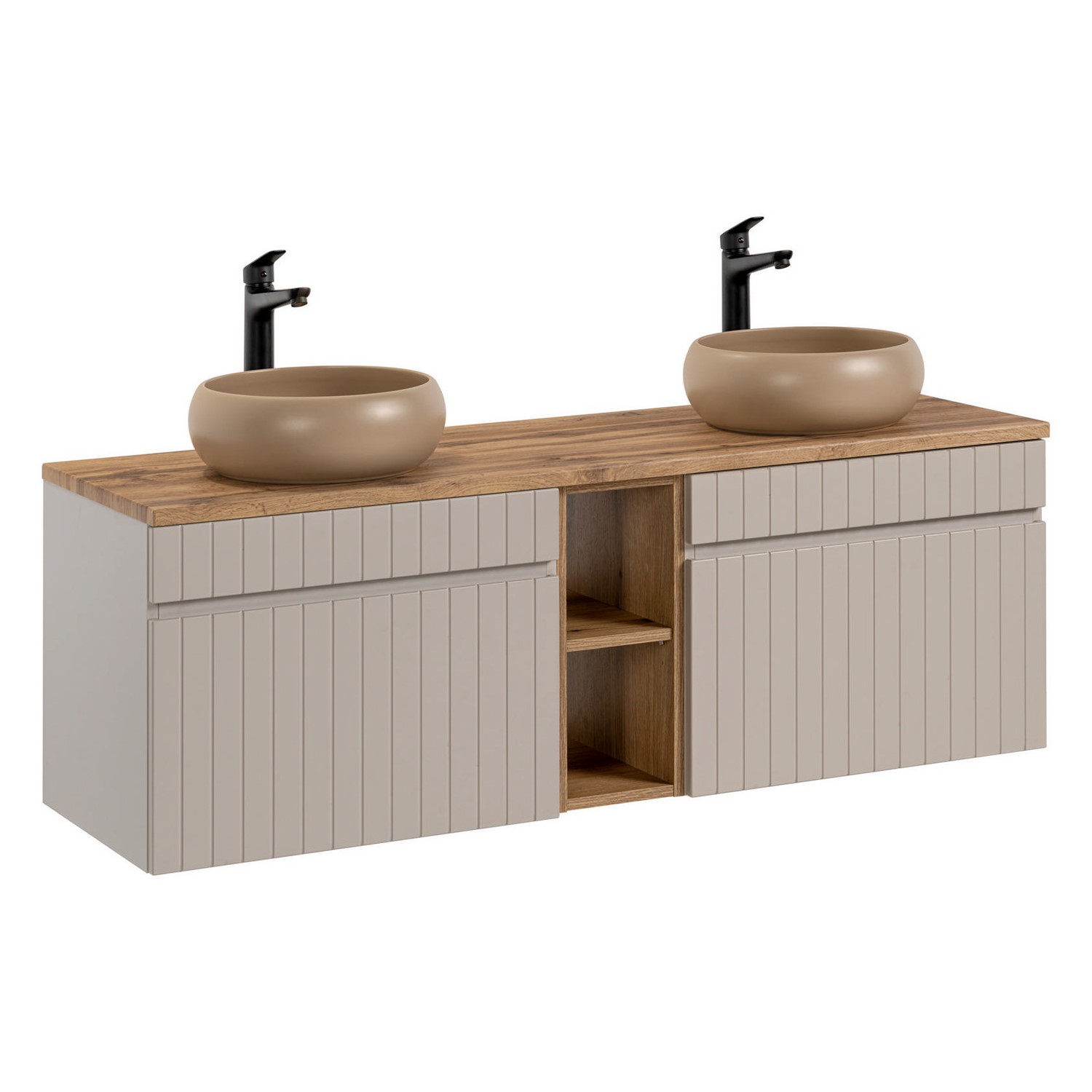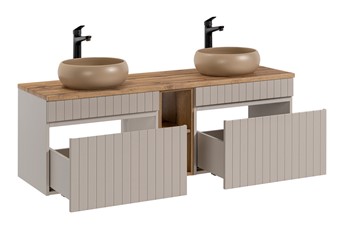 Zestaw szafek z blatem, regałem i umywalkami to idealne rozwiązanie dla osób ceniących elegancję oraz praktyczne wykorzystanie przestrzeni. Ryflowane fronty są szczególnie atrakcyjnym i wszechstronnym elementem wzorniczym, który nadaje meblom unikalny charakter. Wykonana jest z najwyższej jakości materiałów, które gwarantują trwałość i odporność na codzienne użytkowanie. Solidna konstrukcja z płyty laminowanej oraz staranne wykończenie sprawiają, że mebel ten posłuży przez wiele lat, zachowując swój elegancki wygląd. Nowoczesna kolorystyka w odcieniu kaszmirowym jest odpowiedzią na zmieniające się trendy oraz wyszukane potrzeby wizualne klientów.