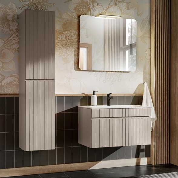 Zestaw mebli łazienkowych to idealne rozwiązanie dla osób ceniących elegancję oraz praktyczne wykorzystanie przestrzeni. To wyrafinowany projekt, który wprowadza do łazienki elegancję i nowoczesny styl dzięki pionowym frezowaniom na frontach. Ryflowanie to wyjątkowy i wszechstronny efekt wzorniczy, który dodaje dynamiki i płynności każdemu wnętrzu, czyniąc je bardziej atrakcyjnym. Nowoczesna kolorystyka nadaje zestawowi subtelnej elegancji, jednocześnie wpisując się w różnorodne style wnętrz - od minimalistycznych po bardziej klasyczne aranżacje. Zestaw składa się z praktycznej szafki i umywalki, wysokiego słupka, lustra oraz lampky led.